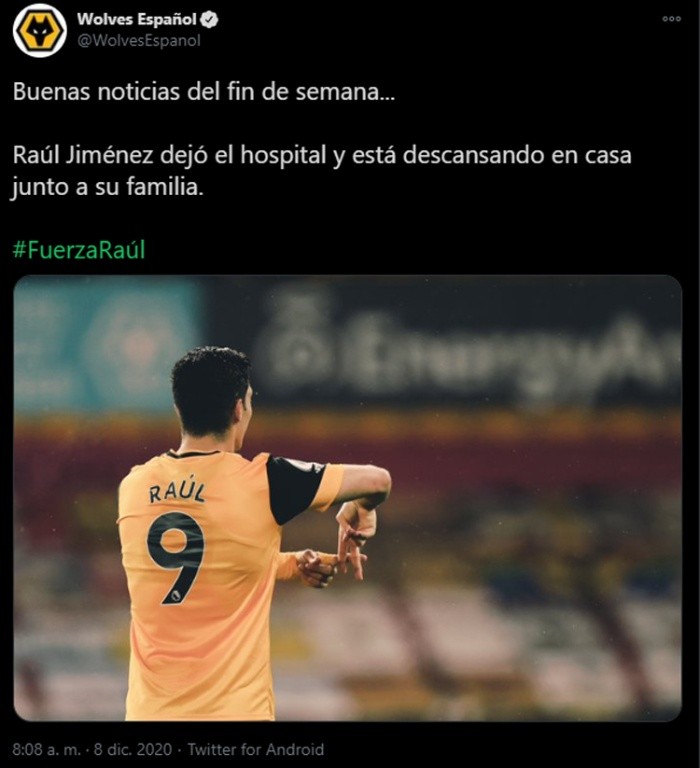 El delantero mexicano Raúl Jiménez ya salió del hospital tras ser operado por un golpe en la cabeza, en el enfrentamiento ante el Arsenal en la Premier League el pasado 30 de noviembre.Raúl Jiménez ya se encuentra con su familia, informó el Wolverhampton este martes, luego de que fuera sometido a una cirugía por una fractura de cráneo, misma que le ocasionó un choque de cabezas con el defensa brasileño David Luiz.“Buenas noticias del fin de semana… Raúl Jiménez dejó el hospital y está descansando en casa junto a su familia. #FuerzRaúl”, informó el equipo de los Wolves en sus redes sociales.Previamente, el entrenador del Wolverhampton Nuno Espirito Santo, había hablado al respecto, en la rueda de prensa posterior a la derrota ante el Liverpool.“Raúl ha vuelto a casa. Estamos encantados de que lo haya hecho. Está mejorando y poco a poco volviendo a la normalidad. Estamos felices de que se esté recuperando bien, pero toma su tiempo. Tiene nuestro apoyo y queremos que regrese fuerte y sano”, dijo.Con información de ESPNOF