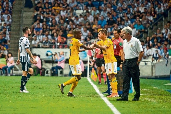 En la enésima ocasión en que se ven las caras estos dos conjuntos, Rayados del Monterrey derrotó por la mínima diferencia a unos Tigres irreconocibles, en el partido de Ida de la Semifinal, cotejo que se llevó a cabo en la cancha maltratada del Estadio BBVA y donde la ventaja fue para los albiazules, que les bastará con un empate en el juego de Vuelta para acceder a la Gran Final del Clausura 2019.El colombiano Dorlan Pabón fue el encargado de darle forma al marcador definitivo, luego de que al minuto 12 hiciera el tanto de la victoria, esto tras dos fallas previas increíbles por parte de Rogelio Funes Mori y Avilés Hurtado.Los felinos de Ricardo ''Tuca'' Ferretti no encontraban la cuadratura al círculo y durante los primeros 45 minutos fueron superados ampliamente, pero para su buena fortuna, solamente recibieron un gol, por lo que se esperaba una reacción en el complemento.Para la segunda mitad, el regaño del técnico brasileño hacia sus dirigidos fue tal, que tras el silbatazo inicial de Jorge Isaac Rojas, Tigres se fue con todo buscando la igualada, pero el ímpetu les duró muy poco, ya que Rayados aplicó la ley del hielo, detuvo las acciones cuando debían hacerlo y buscó apretar el acelerador en el momento indicado.Lo cierto es que durante los últimos 30 minutos, el balón fue un monólogo por parte de Tigres, que ayudado por la complacencia de Monterrey buscó empatar, algo que ya no sucedió, esto ante la impotencia del delantero francés André-Pierre Gignac, quien brilló por su ausencia durante los poco más de 90 minutos que duró el encuentro, en donde nada pudo hacer.El partido de Vuelta pinta para ser todo lo contrario, con unos Tigres que deben irse con todo al frente para empatar el marcador global, cuando se enfrenten el próximo sábado a las 19:00 horas en el ''Volcán''. Para que los felinos avancen a la Final, deben derrotar 1-0 a Monterrey o en caso de que Rayados anote un gol, los auriazules deberán ganar por dos goles de diferencia.Monterrey, por su parte, un empate, un triunfo e incluso una derrota por un gol, siempre y cuando logre anotar como visitante, le dará el pase al partido en donde buscarán la gloria eterna del futbol mexicano.Tanto fue el cántaro al agua, hasta que se rompió. Los Rayados tuvieron dos oportunidades claras para anotar en los primeros instantes, sin embargo Rogelio Funes y Avilés Hurtado no pudieron definir. Tuvo que llegar Dorlan Pabón para corregirles la plana y adelantar a su equipo en la pizarra, siendo la tercera oportunidad la vencida.En la Sultana del Norte quisieron armar la carnita asada y por eso los Tigres echaron toda la carne al asador. Se veían abajo en el marcador y Ricardo Ferretti mandó a Eduardo Vargas y a Lucas Zelarayán para buscar presencia, tanto en el medio campo, como en la línea de ataque, esperando igualar la pizarra.Como es costumbre, Diego Alonso buscó cerrar el compromiso con la ventaja por la mínima diferencia, enviando al terreno de juego al ''Cachorro'' César Montes, retirando del terreno de juego a su máximo talento, Rodolfo Pizarro (foto), renunciando a la tenencia de la pelota, pero aceptando atacar en contragolpe.1. Marcelo Barovero, 21. Miguel Layún, 4. Nicolás Sánchez, 33. John Medina, 17. Jesús Gallardo, 16. Celso Ortiz, 29. Carlos Rodríguez, 20. Rodolfo Pizarro, 8. Dorlan Pabón, 18. Avilés Hurtado, 7. Rogelio Funes Mori, DT. Diego Alonso.Cambios1. Nahuel Guzmán, 28. Luis Rodríguez, 3. Carlos Salcedo, 4. Hugo Ayala, 29. Jesús Dueñas, 20. Javier Aquino, 5. Rafael de Souza, 19. Guido Pizarro, 26. Luis Quiñones, 13. Enner Valencia, 10. André-Pierre Gignac, DT. Ricardo.CambiosÁrbitro: Jorge Isaac RojasSede: Estadio BBVA