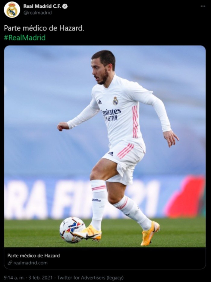 El extremo belga del Real Madrid Eden Hazard sufre una "lesión muscular" en la pierna izquierda, informó este miércoles el Real Madrid, por lo que podría estar un mes de baja.Hazard fue sometido a unas pruebas médicas que han mostrado "una lesión muscular en el recto anterior izquierdo", afirmó el equipo blanco en un breve comunicado.El Real Madrid no precisa el tiempo de baja del jugador limitándose a afirmar que está "pendiente de evolución", pero, según la prensa española, el internacional belga podría estar en torno a cuatro semanas fuera de los terrenos de juego.Hazard, que no entrenó el martes, inició la sesión de este miércoles, pero no pudo completar la práctica retirándose por las molestias que se han traducido en su lesión.Hazard se perderá así, por lo pronto, los próximos partidos de Liga contra Getafe y Valencia, los dos próximos fines de semana.A ello se añade que parece complicado que pueda llegar al partido de ida de octavos de final de la Champions League contra el Atalanta el 24 de febrero.El extremo belga continúa así con su particular calvario de lesiones, que le impiden tener una regularidad en el equipo blanco.El belga estuvo un mes parado tras sufrir una lesión muscular en la pierna derecha a finales de noviembre y antes había estado casi otro tanto fuera de los terrenos de juego por otra lesión, detectada a mediados de septiembre.Entre ambas lesiones, el belga sufrió también el coronavirus, que le mantuvo otros 15 días de baja en la actual temporada.OF