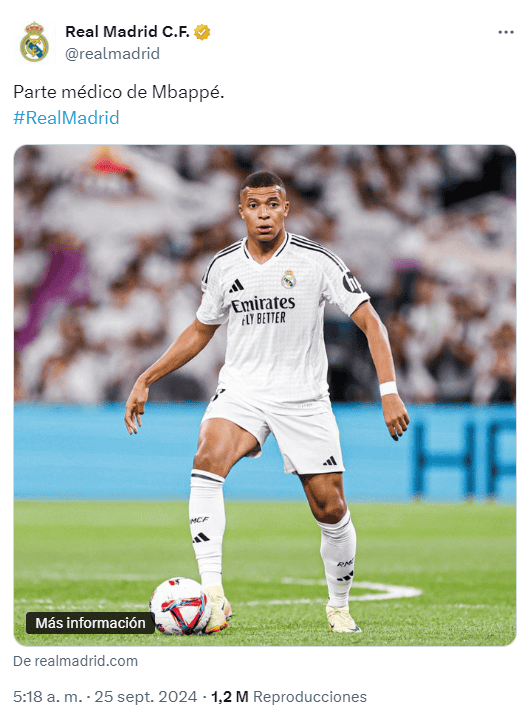 El Real Madrid perderá al delantero francés Kylian Mbappé por varias semanas, de cara al derbi que se jugará en el Estadio Metropolitano ante el Atlético, al confirmar las pruebas médicas a las que sometió en la mañana de este miércoles, tras pedir el cambio en el partido ante el Alavés, una lesión muscular en el bíceps femoral de la pierna izquierda, la primera como su jugador.El equipo blanco publicó en sus redes sociales el parte médico tras la resonancia magnética a la que sometió a Mbappé: "Tras las pruebas realizadas hoy a nuestro jugador Kylian Mbappé por los Servicios Médicos del Real Madrid se le ha diagnosticado una lesión en el bíceps femoral de la pierna izquierda. Pendiente de evolución".El tiempo de baja que se baraja tras las pruebas médicas es de tres semanas, por lo que Mbappé causa baja para su primer derbi ante el Atlético de Madrid y además se perderá el partido de la Champions League frente al Lille y el del Villarreal de LaLiga.No podrá acudir a los partidos de la Selección de Francia en la fecha de octubre de la Nations League de la UEFA, y el objetivo para su regreso sería el día 19, fecha en el que el Real Madrid visita al Celta de Vigo en la jornada previa al clásico del futbol español, ante el Barcelona, para el que Mbappé ya estaría en perfectas condiciones de jugar.Este mismo miércoles, día de descanso para la plantilla madridista, Mbappé ya trabajó en su recuperación en camilla con los fisioterapéutas del Real Madrid en la ciudad deportiva de Valdebebas, según informaron a EFE fuentes del club blanco. El delantero sintió molestias en la segunda parte ante el Alavés y pidió el cambio a Carlo Ancelotti, dejando su sitio a Arda Güler en el minuto 80.Pese a que Ancelotti aseguró en rueda de prensa que Mbappé no tendría problemas de jugar el derbi, el técnico italiano ha recibido una nueva mala noticia en la plaga de lesiones que está marcando el inicio de temporada."Está bien, estaba un poco cargado y me ha pedido el cambio para evitar problemas", aseguró 'Carletto' que pierde a Mbappé en los tres próximos encuentros.La ausencia del delantero francés permitirá a Ancelotti realizar el cambio de sistema que estaba meditando para los partidos grandes, como el del Metropolitano, en el que aumentará la presencia de un centrocampista quitando un delantero.Pierde a Mbappé, pero recuperará a Eduardo Camavinga que este jueves se sumará a la dinámica de grupo tras superar un esguince de rodilla que le ha impedido jugar esta temporada.*Mantente al día con las noticias, únete a nuestro canal de WhatsAppOF