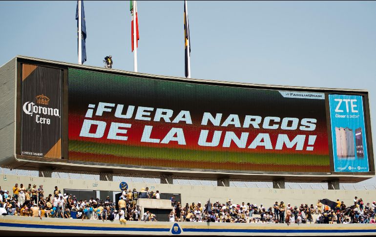 Este domingo, durante el medio tiempo del partido entre Pumas contra Chivas, la pantalla del Estadio Olímpico universitario publicó el mensaje "Fuera narcos de la UNAM"; sobre ello, la oficina del rector Enrique Graue Wiechers expresó que la pantalla pertenece al equipo Pumas, no a la Rectoría.Al ser cuestionado sobre el origen del mensaje que se emitió durante el partido que se celebró este domingo en el Estadio Olímpico, la oficina del rector dijo que "no hay nada por el momento" y cuando se le preguntó si el mensaje que apareció en la pantalla es de Rectoría, esta respondió que "la pantalla es de Pumas, no de la Rectoría".Al inicio del partido, después de entonar el himno universitario, en la pantalla del Estadio Olímpico se mostró la leyenda "Fuera narcos de la UNAM".El viernes ocurrió una balacera dentro del anexo de la Facultad de Contaduría y Administración en la UNAM, tras lo cual resultaron muertos dos hombres de 20 y 29 años de edad que no formaban parte de la comunidad universitaria. RR