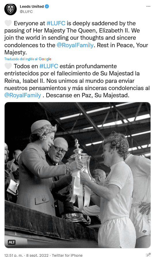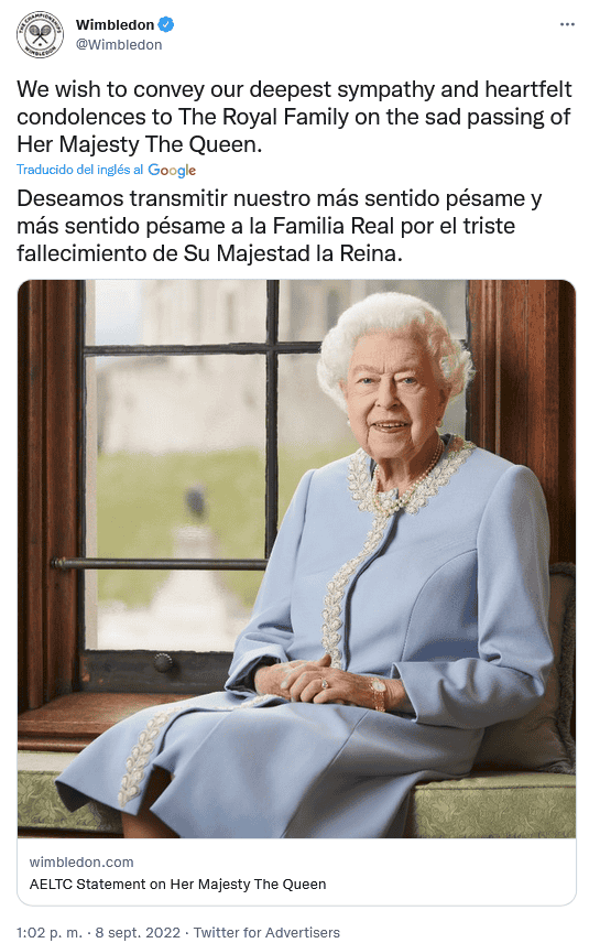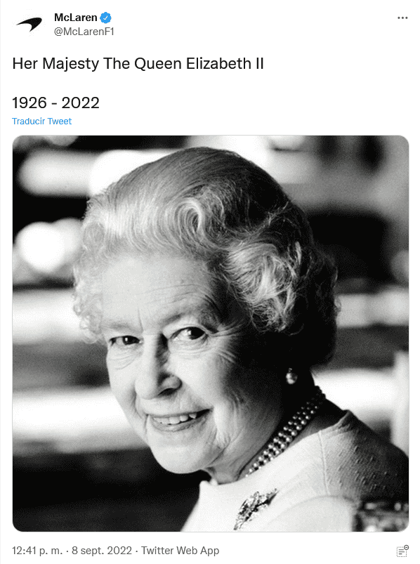 Este jueves 8 de septiembre, la Familia Real informó que la reina Isabel II falleció pacíficamente en Balmoral, en Escocia, y de inmediato, las reacciones del mundo del deporte no se hicieron esperar.La Fórmula 1 comunicó en su página oficial que hoy está de luto por la "muerte de Su Majestad la Reina Isabel II, del Reino Unido de Gran Bretaña e Irlanda del Norte, que ha fallecido a los 96 años".Señalan que al frente de los tributos del deporte a la reina Isabel II estuvo el presidente y director ejecutivo de Fórmula 1, Stefano Domenicali, quien dijo: "La Fórmula 1 lamenta el fallecimiento de Su Majestad la Reina Isabel Il"."Durante más de siete décadas dedicó su vida al servicio público con dignidad y devoción e inspiró a tantos en todo el mundo. La Fórmula 1 envía su más sentido pésame a la Familia Real y al pueblo del Reino Unido y la Commonwealth".En su cuenta de Twitter, el piloto británico George Russell escribió: "Me entristece mucho escuchar sobre el fallecimiento de Su Majestad la Reina Isabel II. Su devoción por nuestro país y su amable liderazgo inspiraron a tantas generaciones de personas en el Reino Unido y en todo el mundo".La liga de futbol inglés publicó en sus redes sociales: "La Premier League está profundamente entristecida al enterarse del fallecimiento de Su Majestad la Reina, Isabel II. Nuestros pensamientos y condolencias están con la familia real y todos los que lloran la pérdida de Su Majestad en todo el mundo".Por su parte, organizadores del torneo de Grand Slam de tenis, Wimbledon, dijo en su cuenta de Twitter: "Deseamos transmitir nuestro más sentido pésame a la Familia Real por el triste fallecimiento de Su Majestad la Reina". OF