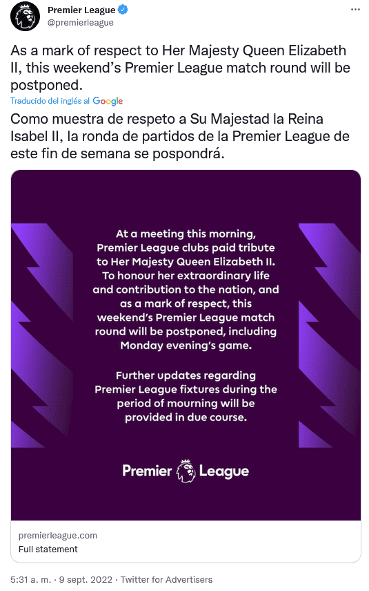 Este viernes, la Premier League informó que todos los partidos de este fin de semana fueron pospuestos como una señal de respeto por la muerte de la reina Isabel II, ocurrida ayer 8 de septiembre.En un comunicado, la liga de futbol inglesa señaló: "Para honrar su extraordinaria vida y contribución a la nación, y como una señal de respeto, los partidos de la Premier League este fin de semana serán aplazados, incluido el encuentro del lunes por la noche".La reina Isabel II, que tuvo el reinado más largo de Reino Unido, falleció ayer después de 70 años en el trono a los 96 años.El Palacio de Buckingham informó en sus redes oficiales que murió en el Castillo de Balmoral, su residencia de verano en Escocia, donde miembros de la familia real británica habían acudido rápidamente después de que su salud empeorara.La reina Isabel II era una fiel aficionada del futbol, en especial del Arsenal, su equipo favorito de la Premier League. Ayer, cuando el conjunto de los "Gunners" comenzaba su camino por el futbol continental en acciones de la Europa League en Zúrich, Suiza, le ofreció un minuto de silencio antes de iniciar el segundo tiempo, en el que también participaron los aficionados del equipo local.OF