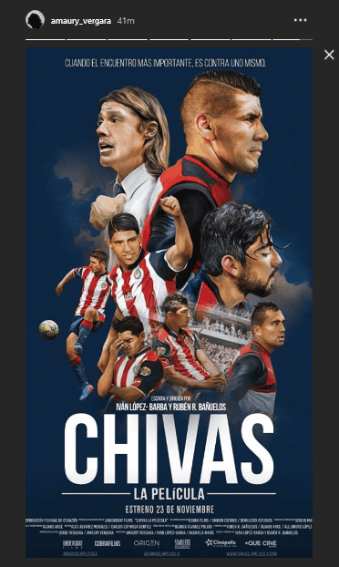 Amaury Vergara, vicepresidente del Grupo Omnilife Chivas, publicó en su cuenta persona del Instagran la imagen del póster de la película de Chivas a estrenarse el próximo 25 de octubre.La imagen muestra a algunos de los protagonistas del torneo Clausura 2017, en el que Chivas se proclamó campeón. Aparecen Carlos Salcido, Alan Pulido, Isaac Brizuela, "Aris" Hernández, Ángel Zaldívar, y Jesús Sánchez, todos aún con el equipo, así como el mediocampista Rodolfo Pizarro, ahora con Monterrey, y el técnico Matías Almeyda, ahora con los San José Earthquakes, de la MLS.El equipo anunció hoy viernes que el filme se exhibirá por primera vez en el marco del Festival Internacional de Cine de Morelia.El club informó que "al estreno asistirán algunos de los jugadores que protagonizan el filme, como Carlos Salcido, Alan Pulido, Isaac Brizuela, Ángel Zaldivar, Jesús Sánchez, Edwin Hernández, Eduardo López, Orbelín Pineda y Jair Pereira".RR