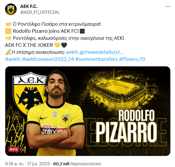 Luego de quedar fuera del Inter de Miami, equipo de la MLS que contrató a Lionel Messi, Rodolfo Pizarro comenzará una nueva aventura en su carrera y lo hará en Europa.El mediocampista es nuevo jugador del AEK de Atenas, equipo en el que milita Orbelín Pineda y que es dirigido por Matías Almeyda, dos hombres que Pizarro conoce a la perfección por el paso de todos ellos en Chivas hace algunos años.El equipo griego confirmó este lunes la llegada del futbolista mexicano, quien ahora tiene contrato hasta el 2025, con posibilidad de extenderlo por uno más.En el AEK, Rodolfo portará el número "70" en su jersey, confirmó el actual campeón del futbol griego."AEK anuncia la adquisición del futbolista Rodolfo Pizarro. El internacional mexicano firmó contrato con nuestro equipo hasta el verano de 2025, con opción a renovar por un año más, y se hizo con el dorsal 70", menciona el comunicado de la escuadra, que porta los colores negro y amarillo.El AEK de Atenas será un club más a la lista de los equipos en los que ha jugado Rodolfo Pizarro como profesional.El mediocampista ha portado las camisetas de Pachuca, Chivas, Monterrey e Inter de Miami, es decir, conjuntos de la Liga MX y la MLS, por lo que su llegada a Grecia le hará por fin cumplir uno de sus sueños, jugar en el balompié del viejo continente.OF