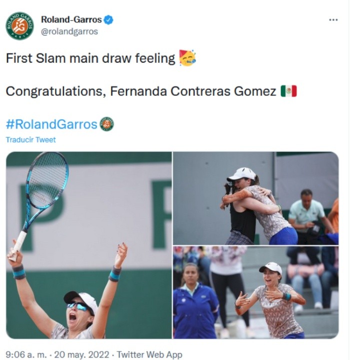 Fernanda Contreras logró el pase al cuadro final de Roland Garros y se convirtió así en la sexta tenista mexicana que consigue disputar un Grand Slam en la historia.Contreras, de 24 años y 204 del mundo, derrotó en el tercer partido de la previa a la suiza Joanne Zuger por 6-1, 3-6 y 6-3.Une su nombre a los de Yolanda Ramírez, Elena Subirats, Patricia Montaño, Angélica Gavaldón y Renata Zarazúa como las mexicanas que han participado en un Grand Slam.La más destacada fue Ramírez, que quedó segunda en dos ocasiones en Roland Garros, en 1960 y 1961, además de ganarlo en dobles en 1958.Subirats alcanzó los cuartos en 1968, mientras que Gavaldón disputó 24 grandes y alcanzó los cuartos de final de Australia en dos ocasiones, 1990 y 1995.OF