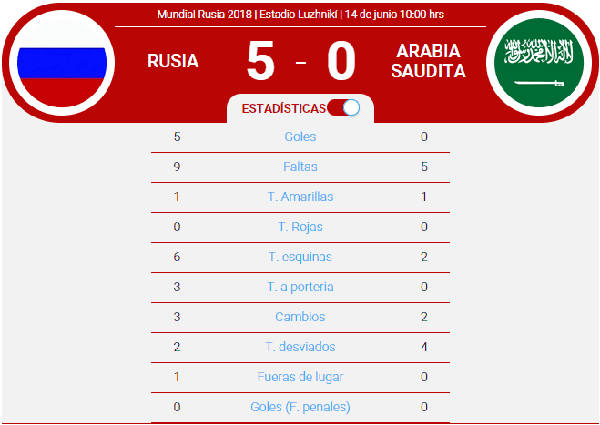 Rusia derrotó por 5-0 a Arabia Saudita en el partido inaugural de la Copa del Mundo Rusia 2018. El juego se disputó en el estadio Luzhnikí de Moscú.El resultado coloca momentáneamente a Rusia a la cabeza del Grupo A, en el que también están incluidos Egipto, Uruguay y los propios sauditas.REPASA EL MINUTO A MINUTO DEL RUSIA VS ARABIA SAUDITARusia dominó el partido desde el inicio, y no tardó en llevar su superioridad al marcador.Al minuto 10 Golovin mandó un centro desde la izquierda que Gazinsky remató de cabeza a segundo poste para abrir el marcador.Ante una Arabia Saudita inofensiva, a los anfitriones les bastó formar dos líneas de cuatro cuando defendían para anular sin esfuerzo a sus rivales.Rusia perdió a Dzagoev, uno de sus hombres más talentosos, al minuto 23' a causa de una lesión. Luego de su salida el partido bajó la intensidad, pero retomó ritmo al final del primer tiempo, que concluyó con el segundo tanto ruso.Tres minutos antes del silbatazo de medio tiempo, Cheryshev, que entró por Dzagoev, concluyó con una gran jugada individual una llegada de Rusia por el flanco derecho y mandó los equipos al descanso con una cómoda ventaja 2-0 sobre los sauditas.Suponiendo que el partido estaba resuelto, los rusos se volvieron complacientes en el segundo tiempo, y los sauditas aprovecharon para generar sus primeras jugadas de peligro, al 55' y al 58', suscitando los silbidos del público local a su propia Selección.Los anfitriones reaccionaron y anotaron al 70' el gol que sentenció definitivamente el partido. En una jugada derivada de un saque de manos, Dzyuba, con sólo unos minutos en la cancha, remató de cabeza para poner el tercer tanto a favor de Rusia.Por si el dominio en todo el partido no fuera suficiente, el combinado saudita colapsó en tiempo de compensación y admitió dos goles, uno de tres dedos anotado por Cheryshev al 90+1 y otro en cobro de tiro libre de Golovin al 90+3.Egipto y Uruguay, los otros dos integrantes del Grupo A se medirán mañana viernes a las 7:00 de la mañana (tiempo del centro de México), en Ekaterimburgo.