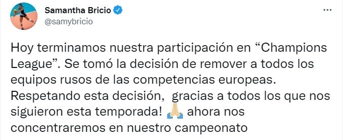 Samantha Bricio, la mejor voleibolista de México, es una víctima colateral del conflicto armado entre Rusia y Ucrania.Lo anterior se debe a que la jugadora tapatía milita en el Dinamo Kazan, equipo profesional de voleibol en Rusia que fue expulsado de las competencias a nivel europeo.“Hoy terminamos nuestra participación en Champions League. Se tomó la decisión de remover a todos los equipos rusos de las competencias europeas. Respetando esta decisión, ¡gracias a todos los que nos siguieron esta temporada! Ahora nos concentraremos en nuestro campeonato”, comentó la mexicana.Recientemente, la FIFA y la UEFA anunciaron que los equipos rusos de futbol (selecciones o clubes) no podrán participar en torneos internacionales, y ahora el voleibol se une a la lista de las disciplinas que han sufrido los estragos de la guerra.JL