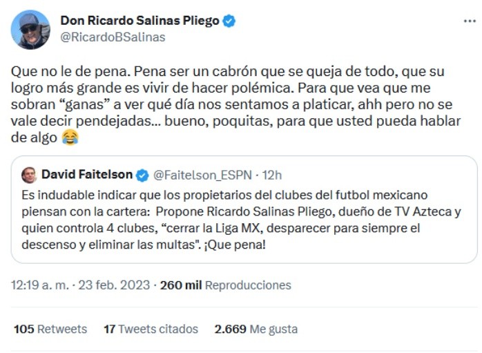 Luego de que el empresario Ricardo Salinas Pliego sugiriera eliminar el descenso en la Liga MX, el periodista deportivo David Faitelson dijo que el magnate quiere "apoderarse" del futbol mexicano, pues "piensa con la cartera".Por medio de Twitter, el fundador de Grupo Salinas consideró indispensable lograr la salud y estabilidad financiera de los equipos de la Liga MX."Es indispensable lograr la salud y estabilidad financiera de los equipos de la Liga MX para que los dueños podamos pensar y actuar con la visión de largo plazo, para invertir y poder formar nuevos jóvenes jugadores", se lee en el tuit.Sin embargo, el conductor de deportes cuestionó su dicho, pues "es indudable indicar que los propietarios de clubes del futbol mexicano piensan con la cartera"."Propone Ricardo Salinas Pliego, dueño de TV Azteca y quien controla 4 clubes, 'cerrar la Liga MX, desaparecer para siempre el descenso y eliminar las multas'. ¡Qué pena!"."Tengo la impresión de que Ricardo Salinas Pliego... quiere apoderarse del futbol mexicano", agregó.Ante ello, el dueño de Elektra respondió a Faitelson, quien, dijo, "que su logro más grande es vivir de hacer polémica". "Que no le de pena. Pena ser un cabr.. que se queja de todo, que su logro más grande es vivir de hacer polémica. Para que vea que me sobran "ganas" a ver qué día nos sentamos a platicar, ahh pero no se vale decir pendej... bueno, poquitas, para que usted pueda hablar de algo".Por su parte, el periodista deportivo señaló: "Don Ricardo Salinas Pliego: el futbol no se maneja como usted lo hace ==exitosamente, por cierto== en la televisión, en Elektra, en Banco Azteca y demás empresas. El futbol es un tema diferente. Usted y el resto de los dueños saben hacer negocios, pero de futbol no tienen idea…".Finalmente, el dueño de TV Azteca invitó al cronista a tomarse un café. "David… dime la verdad, ¿tú si sabes de futbol, dónde aprendiste?, ¿Cuántos equipos has tenido?, ¿Cuántos has administrado? Platicamos, pero de frente y en persona… de ex patrón a ex empleado, hasta café nos tomamos", sentenció.vll