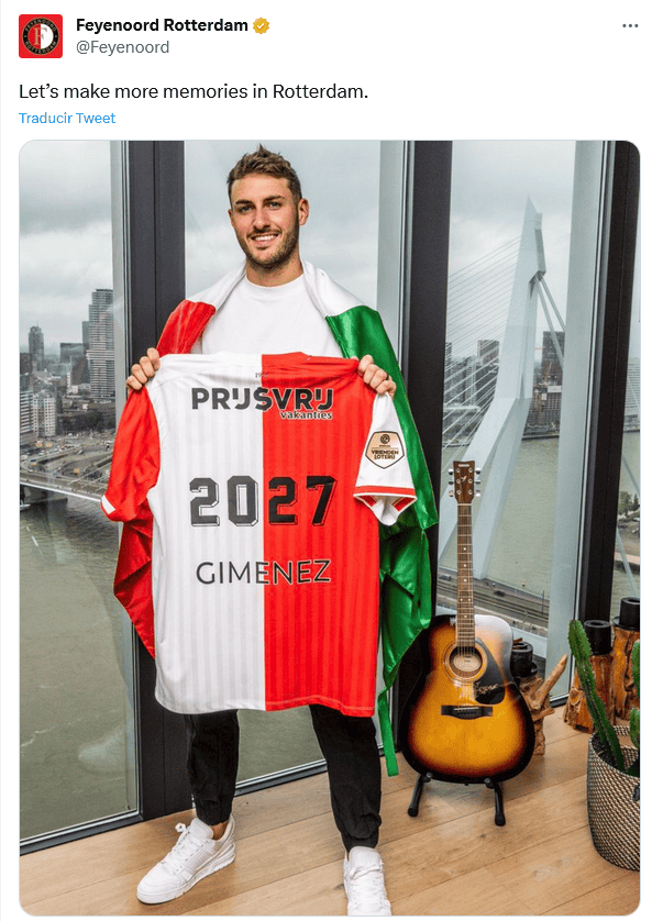 Después de varias semanas de rumores, el delantero Santiago Giménez ya conoce su futuro, pues hoy el Feyenoord de Países Bajos anunció una importante noticia.El delantero de la Selección Mexicana informó de manera oficial la ampliación de su contrato con el conjunto neerlandés, equipo que aseguró tener al mexicano hasta el año 2027.Después de darse a conocer el interés de varios equipos europeos, quienes buscaron los servicios de Giménez, el Feyenoord presumió la nueva firma del exjugador de Cruz Azul.El club publicó un mensaje en sus redes sociales en las que también aparece una fotografía del delantero, ex de Cruz Azul, donde se le ve sonriendo, y en la que muestra una playera con los números del año de su nuevo contrato.OF