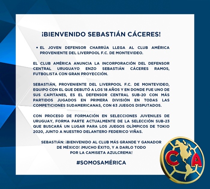 El defensa central uruguayo Sebastián Cáceres es oficialmente refuerzo del América para el Torneo Clausura 2020 de la Liga MX, quien reportará al término del preolímpico de Conmebol.A través de un comunicado, el conjunto azulcrema confirmó la llegada de Cáceres, quien tiene 20 años y procede del Liverpool FC de Montevideo."El club América anuncia la incorporación del defensor central uruguayo Enzo Sebastián Cáceres Ramos, futbolista con gran proyección", anunció en sus redes sociales el cuadro americanista la noche del miércoles.El zaguero, quien debutó a los 18 años, se convierte en el cuarto refuerzo del equipo luego de la confirmación de Leo Suárez, Jesús Escoboza y Luis Fuentes, quien dará solidez defensiva a los pupilos de Miguel Herrera."Con proceso de formación en selecciones juveniles de Uruguay, forma parte actualmente de la selección Sub 23 que buscará un lugar para los Juegos Olímpicos de Tokio 2020", junto a su nuevo compañero de equipo y compatriota, Federico Viñas.Finalmente, el equipo mexicano le da la bienvenida "al club más grande y ganador de México", además de desearle mucho éxito e invitarlo a "darlo todo por la camiseta azulcrema".El jugador, quien portará el número 4 con las Águilas, también fue presentado por Viñas, que en un video publicado en sus redes sociales anuncia a la nueva incorporación del América y luce sonriente.América siguió este miércoles con su preparación rumbo a su debut en el torneo mexicano, el cual se dará el sábado cuando le hagan los honores a Tigres de la UANL en el estadio Azteca, donde comenzarán su andar luego de caer en la final del Apertura 2019 con Monterrey.JL