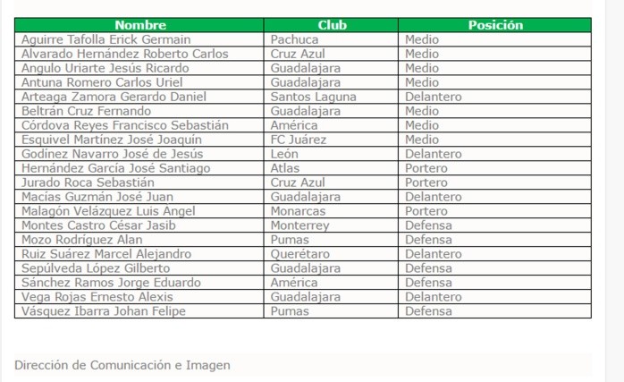 Este martes se dio a conocer la lista final de los 20 jugadores convocados por el técnico de la Selección Mexicana Sub-23, Jaime lozano, que participará en el Campeonato Preolímpico de la Concacaf, torneo que se llevará a cabo del 20 de marzo al 1 de abril en Guadalajara. En la lista destacan seis elementos de Chivas y uno de Atlas.La concentración iniciará el domingo 15 de marzo en esta ciudad.El Tricolor se ubica en el Grupo A con Estados Unidos, Costa Rica y República Dominicana. En el B, se encuentran las selecciones de Honduras, Canadá, El Salvador y Haití.El 20 de marzo, el equipo mexicana hará su debut ante los dominicanos; el día 23 se enfrentará a Costa Rica; y finalmente, cerrará la fase de grupos el día 26 ante el combinado de EU. Las semifinales y la final serán el 30 de marzo y el 1 de abrilLos encuentros serán en el Estadio Jalisco y el Estadio Akron.OF