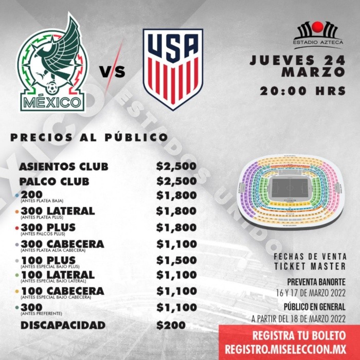 Cuando se anuncian las fechas de la Eliminatoria de la Concacaf rumbo al Mundial, el partido de la Selección Mexicana ante el combinado de Estados Unidos, suele marcarse como el encuentro más llamativo para que la afición asista al Estadio Azteca. La mala noticia esta vez es que, aunque el nivel del Tri ha dejado mucho que desear, al grado de que se cuestiona la continuidad de Gerardo "Tata" Martino en el banquillo, los precios para asistir al Estadio Azteca están por las nubes, como si se tratara de un partido de primer nivel. El boleto más barato para acceder al Coloso de Santa Úrsula tiene un costo de $1,100 pesos, según compartió la cuenta oficial de Twitter del Estadio Azteca. El boleto más cara para la zona Asientos Club y Palcos Club, tienen un costo de $2,500. Será el próximo jueves 24 de marzo cuando en punto de las 20:00 horas, la Selección Mexicana se mida ante el conjunto de las barras y las estrellas en la recta final del hexagonal rumbo al Mundial de Qatar 2022.JL