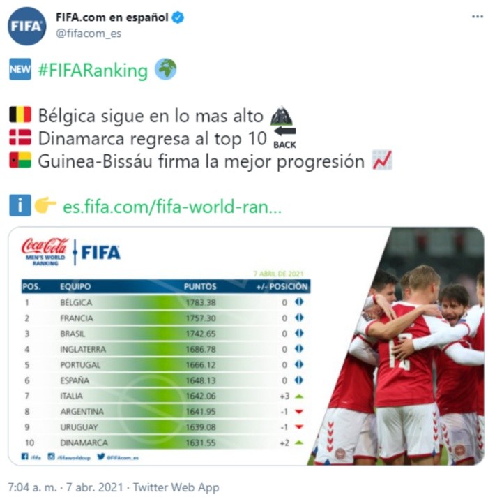 La Selección de Brasil se mantiene en la tercera posición del ranking mundial de la FIFA, que no sufre variación alguna en las primeras plazas salvo el ascenso de Italia al séptimo puesto, lo que le permite superar a Argentina y Uruguay, y la salida del Top-10 de México por la progresión de Dinamarca.Bélgica continúa un mes más al frente por delante de Francia, actual campeona mundial, y Brasil, en tanto que Inglaterra y Portugal son cuarta y quinta.Dinamarca accede al Top-10 del que baja a México, ahora en el lugar 11 justo por delante de Alemania.OF