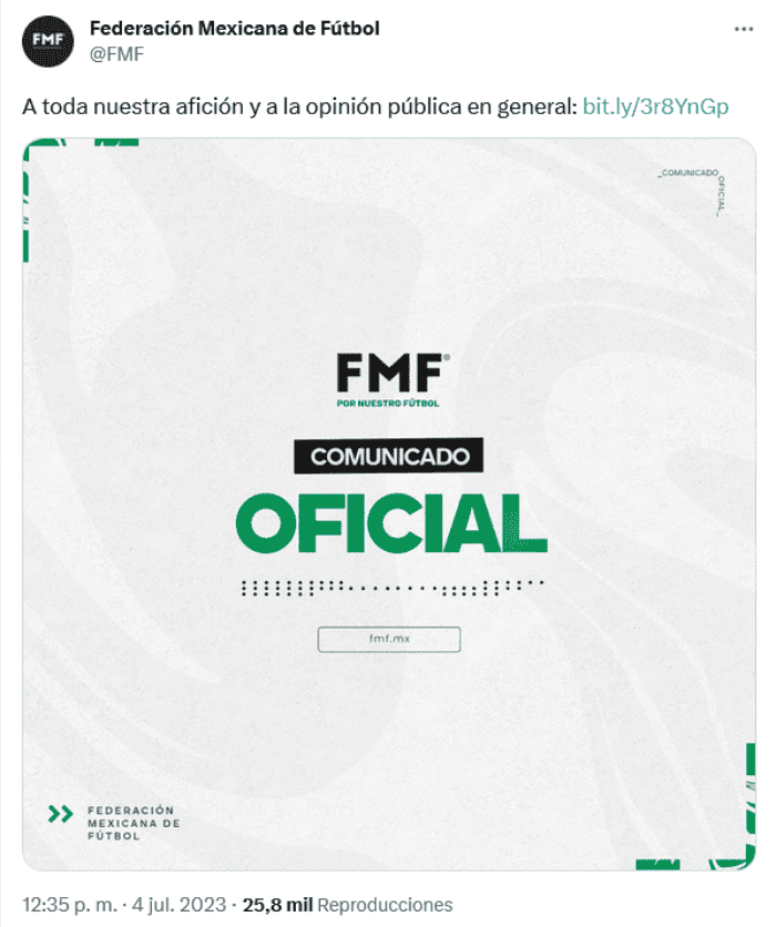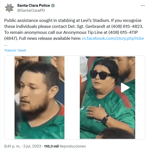 Este martes 4 de julio, la Federación Mexicana de Futbol (FMF) publicó un escueto comunicado en el que lamenta y condena rotundamente los actos de violencia que se suscitaron después de que concluyera al partido México vs Qatar el domingo pasado en el Levi's Stadium de Santa Clara, California, Estados Unidos."En la Federación Mexicana de Futbol lamentamos y condenamos rotundamente los actos de violencia que se suscitaron posterior al partido del domingo pasado en Santa Clara"."Tenemos toda la disposición de cooperar y unir esfuerzos con la Concacaf, los estadios y autoridades locales, para evitar que estos actos se repitan en cualquier estadio; estamos seguros que las instancias correspondientes tomarán las medidas necesarias para llegar hasta las últimas consecuencias en contra de quienes resulten responsables, y deseamos la pronta recuperación de quien resultó lesionado", dice el texto."Los estadios son espacios familiares y, por tanto, deben ser un lugar seguro para todos", finaliza el documento.La Selección Mexicana se midió el domingo a Qatar en la última jornada de la fase de grupos de la Copa Oro 2023, un partido en el que perdieron por 1-0, y que además fue escenario de un hecho escalofriante en la tribuna.En redes sociales circula el video de una pelea donde aficionados de la Selección Mexicana se pelean en las gradas del Levi's Stadium. Entre las grabaciones circula una en la que se aprecia cuando un sujeto lesiona a otro con un cuchillo y lo deja sangrando mientras escapa entre la multitud.El impactante video muestra la gravedad de la herida, mientras que otros aficionados intentan parar el flujo de sangre del afectado.Elementos de la policía local ya estén buscando al individuo que entró con el arma blanca al estadio.En la cuenta de Twitter de la policía de Santa Clara se encuentra la publicación donde las autoridades piden más información sobre los individuos involucrados en el hecho violento."Se busca. Si reconoce a estas personas, comuníquese con el Det. sargento Gerbrandt al (408) 615-4823. Para permanecer en el anonimato, llame a nuestra línea de información anónima al (408) 615-4TIP (4847)", dice la publicación.En un comunicado, autoridades detallan más sobre el señalado del acto violento en el estadio."El sospechoso se describe como: un adulto hispano, de sexo masculino, entre 25 y 35 años, corpulento con cabello corto de color oscuro, bigote fino y barba fina. Fue visto por última vez vistiendo una camiseta de futbol de color verde de la selección mexicana. El sospechoso estaba con una mujer adulta hispana corpulenta con cabello oscuro y una camiseta similar de futbol del equipo nacional mexicano. En este momento, la mujer es una persona de interés".OF