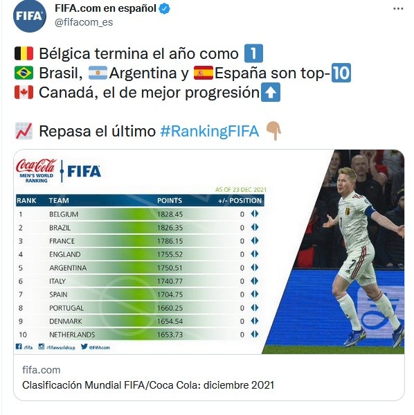 Este jueves 23 de diciembre, la FIFA dio a conocer el último ranking de selecciones nacionales del año 2021, en el que la Selección Mexicana de futbol se ubicó en la posición 14, con mil 638 puntos, manteniéndose en el mismo lugar de la clasificación anterior, pero lejos del Top-10.El año pasado, debido a la pandemia de COVID-19 solo se pudieron 352 partidos de selecciones nacionales, din embargo, en 2021 se jugaron mil 116, los cuales repercutieron directamente en la clasificación de los equipos en el ranking, entre ellos la Selección Mexicana.Por cuarto año consecutivo, indica la FIFA, Bélgica cierra el año a la cabeza, aunque no muy lejos de Brasil en el segundo lugar; Francia completa el podio, mientras que Inglaterra y argentina cierran el Top-5.Canadá es la selección con el mejor progreso del año, pues inició el año en el lugar 73 y cerró en el 40. Por su parte, las selecciones de Italia (6ta) y Argentina (5ta) mantuvieron buenos lugares entre las mejores 10 por haber ganado la Eurocopa y la Copa América respectivamente.Estados Unidos se ubica, de momento, como la mejor selección de la Concacaf, en el lugar 11, por encima de México; Canadá les sigue en el lugar 40, mientras que Costa Rica termina 2021 en el peldaño número 49.El próximo ranking de la FIFA se dará a conocer el próximo 10 de febrero de 2022.Puedes consultar el ranking de la FIFA completo aquí.OF