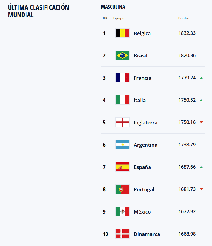 La FIFA dio a conocer el ranking del mes de octubre, periodo en el que estaban programados partidos de la eliminatoria Mundialista a Qatar 2022, amistosos, y la fase final de la UEFA Nations League. Según indica, fueron 160 los juegos disputados, los cuales tuvieron impacto sobre la clasificación de este 21 de octubre. A la Selección Mexicana nadie la mueve, y el Tri se mantiene en el Top-10 del ranking.La Selección de Bélgica, que se ha mantenido ya por largo tiempo como la número uno del mundo, tambalea, aunque siguen en la cima pese a las derrotas obtenidas en la Nations League ante Francia e Italia, que suben un puesto.Brasil sigue en la segunda posición, pero se acerca peligrosamente al liderato por apenas 12 puntos. Por su parte, Inglaterra cae dos posiciones hasta el quinto sitio.España sube a la séptima posición, Portugal baja a la octava; Alemania sube al lugar 12 y supera a Estados Unidos (en el 13) y Uruguay, que baja tres peldaños (cae al 15) y protagoniza la mayor caída entre las mejores 20 selecciones.A México nadie lo mueve, y se mantiene firme como la mejor selección de la Concacaf, en el noveno lugar del ranking de la FIFA.Marruecos sube cuatro puestos hasta la posición 29, Rusia llega al 33, Egipto al 44, Arabia Saudita al 49 y Sudáfrica al 67; estos conjuntos nacionales ascendieron luego de vencer en sus dos partidos para la clasificación a Qatar 2022.El próximo ranking de la FIFA se dará a conocer el 25 de noviembre.OF