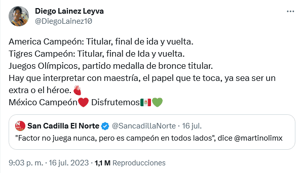 El atacante de Tigres, Diego Lainez, no se quedó callado y le respondió a Christian Martinoli, narrador de TV Azteca, quien hizo un comentario sobre él durante la final de la Copa Oro 2023, en la que la Selección Mexicana venció a Panamá 1-0 con gol de Santiago Giménez en los últimos minutos del partido y terminó como ganadora del título de la Concacaf.Durante la transmisión, Martinoli dijo: "Factor no juega nunca, pero es campeón en todos lados", recordando que el comentarista ha apodado así al exfutbolista del Betis y América.Esta frase de Christian se replicó en las redes sociales y fue ahí donde Lainez, que recién levantó el título de la Liga MX con los Tigres, contestó:"América Campeón: Titular, final de ida y vuelta. Tigres Campeón: Titular, final de Ida y vuelta. Juegos Olímpicos, partido medalla de bronce titular. Hay que interpretar con maestría, el papel que te toca, ya sea ser un extra o el héroe. México Campeón Disfrutemos".OF