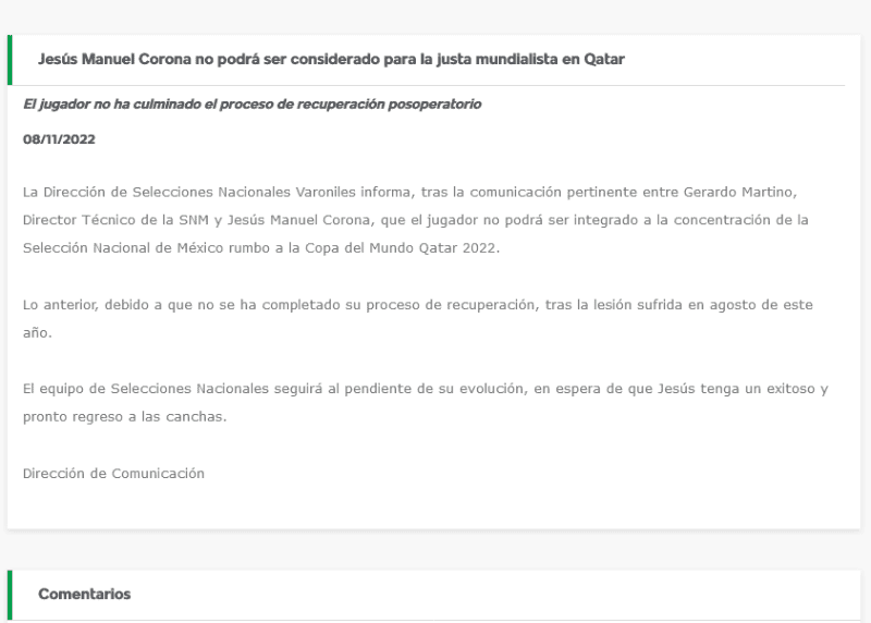 ¡Es oficial! La Dirección de Selecciones Nacionales confirma que Jesús "Tecatito" Corona no ha culminado el proceso de recuperación postoperatorio, por lo que se perderá el Mundial de Qatar 2022.Tras la comunicación pertinente entre el técnico Gerardo "Tata" Martino y Jesús "Tecatito" Corona, se determinó que el jugador no podrá ser integrado a la concentración de la Selección Mexicana, rumbo a Qatar 2022.Esto se debe a que no se ha completado su proceso de recuperación, tras la lesión sufrida en agosto de este año durante un entrenamiento con el Sevilla, equipo de LaLiga de España en el que milita."El equipo de Selecciones Nacionales seguirá al pendiente de su evolución, en espera de que Jesús tenga un exitoso y pronto regreso a las canchas", dice el comunicado.OF