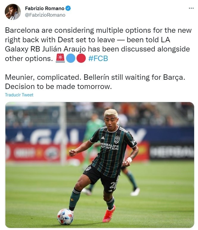 El mercado de fichajes en Europa concluye mañana 1 de septiembre y el cierre no podría estar siendo más emocionante. En las últimas horas, ha surgido con fuerza un rumor que coloca a un jugador de la Selección Mexicana en la órbita del FC Barcelona. Tras la salida de Sergiño Dest con rumbo hacia el AC Milan, el Barcelona estaría buscando en el último día de fichajes a un lateral derecho que se adapte a lo que Xavi Hernández desea y uno de los nombres que han salido a la luz, según el reconocido experto en el mercado, Fabrizio Romano, es Julián Araujo, futbolista que milita en Los Angeles Galaxy. Julián Araujo se ha adueñado de la parcela derecha en el LA Galaxy y es uno de los recurrentes en las convocatorias de Gerardo "Tata" Martino con la Selección Mexicana. A sus 21 años, Julián Araujo ha sido relacionado también con el Club América y el Porto, sin embargo, de confirmarse el interés del Barcelona y por la premura de la situacion que atraviesan los culés, en las próximas horas el lateral mexicano podría convertirse en nuevo futbolista de Xavi Hernández y compañía. JL