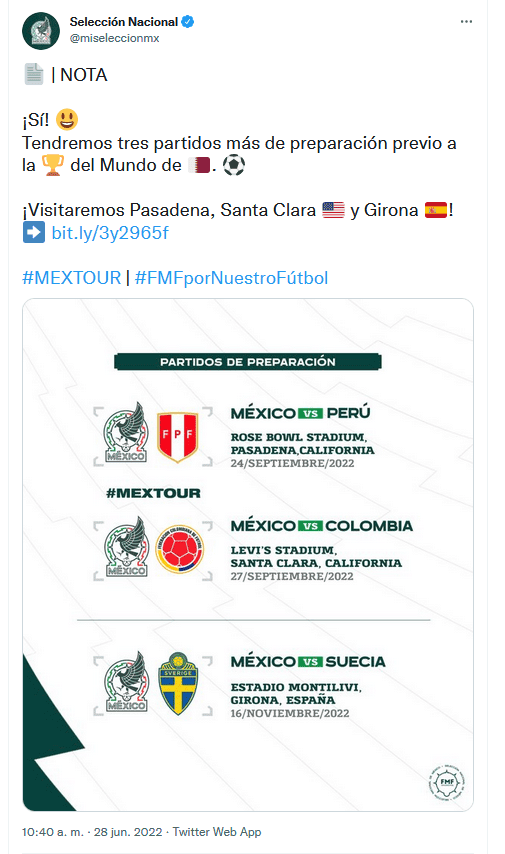 La Selección Mexicana de futbol sigue planificando su preparación de cara al Mundial de Qatar 2022, y es por eso que hoy martes anunció a tres nuevos rivales a los que enfrentará en partidos amistosos.Se trata de Perú, Colombia y Suecia, sinodales con los que México tendrá que medirse para ponerse a punto antes de su participación en tierras mundialistas.Aunado al juego que el Tri disputará contra Paraguay el 31 de agosto, posteriormente el equipo de Gerardo Martino deberá toparse contra Perú en un duelo pactado para el próximo 24 de septiembre en el Rose Bowl Stadium de Pasadena, California.Asimismo, tres días después (27 de septiembre) México estará en Santa Clara, California, para medir fuerzas contra Colombia en el Levi's Stadium.Por último, nuestra selección deberá viajar a España para enfrentarse contra Suecia en el Estadio Montilivi, de Girona, esto en un compromiso pactado para el 16 de noviembre, justo antes de que dé inicio la Copa del Mundo en territorio qatarí.Luego de ese juego contra Suecia, el Tri debutará en el Mundial el 22 de noviembre, fecha en que el combinado azteca jugará su primer partido de Fase de Grupos contra Polonia.OF