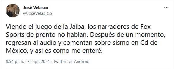 Un sismo de magnitud 7.1 sacudió el sur y el centro del país, fenómeno que dejó como saldo preliminar una persona fallecida y cortes al suministro eléctrico. Se sintió en los estados de Guerrero, Morelos, Estado de México, Oaxaca, entre otros, además de la Ciudad de México, donde una función de lucha libre y la transmisión de un partido de futbol se vieron interrumpidos.En redes sociales circulan mensajes que muestran los hechos. En el primero, un video, se ve cómo el sismo sorprendió a los aficionados que habían acudido a la Arena México para la función de la noche del martes.En el ring se enfrentaban Stuka Jr., Blue Panther Jr. y Dark Panther, contra Hechicero, Mephisto y Luciferno, cuando el inmueble comenzó a sacudirse. Los aficionados se mostraron tranquilos mientras las luces comenzaban a parpadear y los guerreros buscaban refugio.En su cuenta de Twitter, la cuenta oficial del Consejo Mundial de Lucha Libre informó que tras efectuar los protocolos y sin novedad, la actividad luchística se reanudó.Luego, en redes sociales se dio cuenta de cómo la parte final de la transmisión del partido Raya2 vs Tampico Madero quedó sin narradores, debido a que los cronistas se encontraban en la Ciudad de México, donde se percibió con intensidad el temblor.El delantero chileno Humberto ''Chupete'' Suazo había regresado a las canchas del futbol mexicano para la escuadra de Expansión MX de Rayados de Monterrey, y cuando estuvo cerca del gol no hubo quien narrara la jugada debido al movimiento telúrico. "Estuvo muy duro el sismo", dijeron los comentaristas al regresar al sonido en las pantallas de Fox Sports.¿Quieres saber más?Si quieres tener más contenido, más imágenes y aún más noticias, entonces descarga INFORMAPlus, la aplicación digital de EL INFORMADOR, donde tenemos materiales exclusivos para ti.Descarga la aplicación y pruébala GRATIS por treinta días.Si eres suscriptor de EL INFORMADOR tu acceso está incluido, solicítalo al 33 3678-7777OF