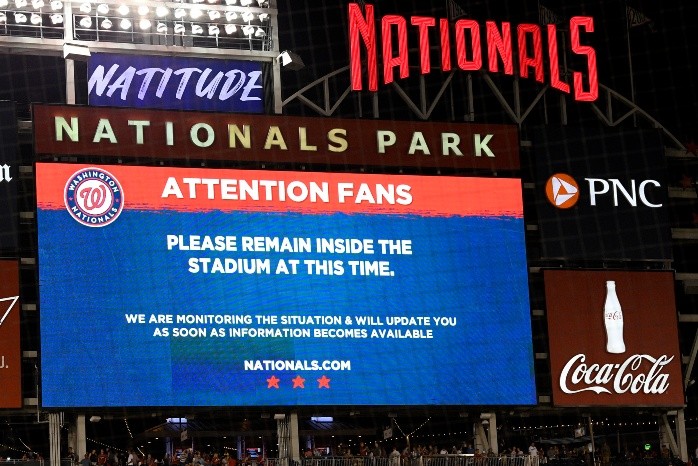 El juego de los Padres de San Diego en casa de los Nacionales de Washington se suspendió este sábado en la sexta entrada, luego que el equipo local informó que se había reportado un tiroteo frente al estadio. No surgieron detalles de inmediato sobre lo que había ocurrido.Dos personas fueron alcanzadas por los disparos, dijo Dustin Sternbeck, vocero del Departamento de la Policía Metropolitana. Con base en información preliminar, los investigadores indicaron que una de las víctimas era un empleado del estadio.Más tarde, la policía de Washington tuiteó: "Dos víctimas adicionales relacionadas con este incidente ingresaron en hospitales del área para recibir tratamiento por heridas de bala".Una treintena de policías, vehículos, ambulancias y camiones de bomberos estaban en la calle aledaña al Nationals Park, por el lado de la antesala.Los Padres habían ingresado recién al terreno para disputar la parte baja de la sexta entrada cuando se escucharon varias detonaciones desde el lado izquierdo del recinto.Los fanáticos que estaban sentados detrás del jardín izquierdo comenzaron a marcharse por la puerta del bosque central.Poco tiempo después, los espectadores que se encontraban por el lado de la inicial abandonaron sus asientos.Algunos fanáticos se aglomeraron en la cueva de los Padres, del lado de la antesala, en busca de protegerse. Desde el interior del estadio se escuchaban las sirenas.Los Nacionales anunciaron después que se había presentado un incidente fuera del parque. En la pantalla electrónica desplegaron un mensaje que pedía a los espectadores permanecer en el interior.Unos 10 minutos después, el equipo tuiteó: "Se ha reportado un tiroteo fuera de la puerta de la tercera base en el Nationals Park. Se exhorta a los fanáticos a salir del parque por las puertas del jardín central y el jardín derecho esta vez".Los Padres ganaban 8-4 cuando el juego se interrumpió. Se reanudará el domingo por la tarde, seguido por el encuentro que estaba previsto para el domingo.JL