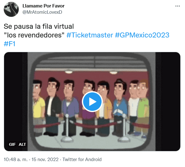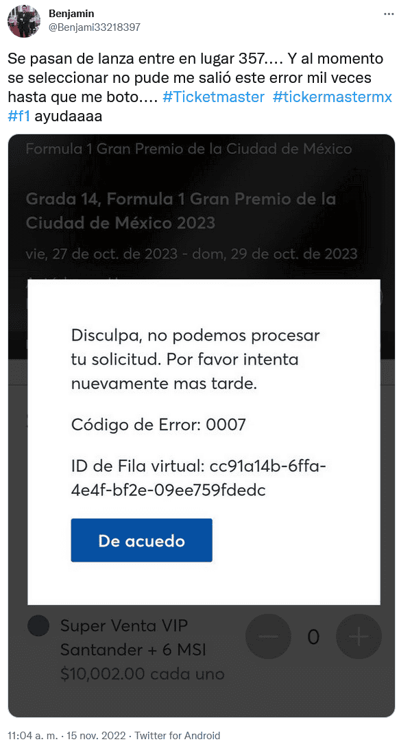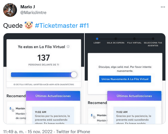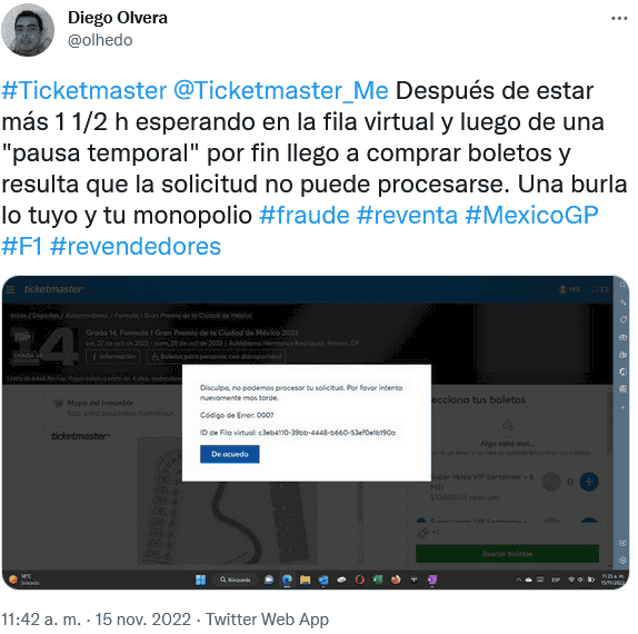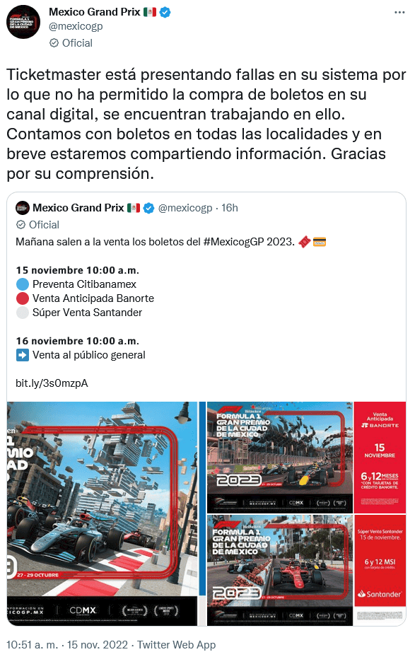 La Fórmula 1 anunció hace dos semanas que el siguiente Gran Premio de México será del 27 al 29 de octubre de 2023, pero no sólo eso, también dio a conocer los precios de los boletos y cuándo comenzarían a venderse los mismos a través de la plataforma Ticketmaster.Fue este martes 15 de noviembre cuando los fanáticos de la F1 pudieron empezar a gestionar la compra de sus entradas para la carrera del siguiente año, sin embargo, en redes sociales han acusado muchos problemas con la página para obtenerlos, señalando que en algunos casos marca "error"."¿Cómo ya no va a haber boletos en grada 2 para la F1, ni con priority, ni en preventa?", cuestiona la usuaria @JuliFeregrino; "Tres horas a la basura, sin boletos para la f1, gracias", reclama @Karohigareda; "En la vida vuelvo a comprarte un boleto, 30 años comprándote y saboteas la F1, no puedo creer que no tengas la tecnología para atender la demanda", dice por su parte @MiqueVike.Entre tantas quejas de tuiteros, el perfil oficial del Gran Premio de México explicó que: "Ticketmaster está presentando fallas en su sistema por lo que no ha permitido la compra de boletos en su canal digital, se encuentran trabajando en ello. Contamos con boletos en todas las localidades y en breve estaremos compartiendo información. Gracias por su comprensión".Tras esto, los usuarios de Twitter deberán seguir esperando hasta que la plataforma deje de presentar los errores.Antes de que se corriera el Gran Premio de México 2022 el pasado domingo 30 de octubre, se anunció con bombo y platillo la renovación del gran Circo en el país hasta 2025, lo que ha hecho felices a muchos seguidores del deporte.OF