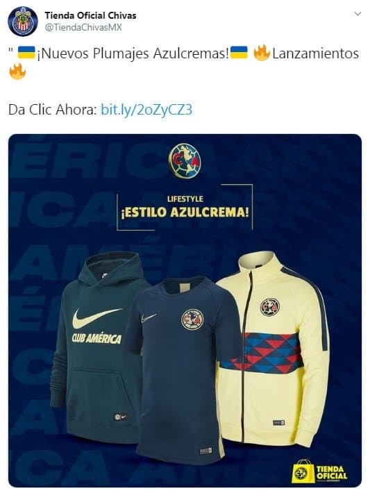 Está bien que desde hace tiempo estén en consolidación financiera, pero ¿Dónde está el respeto para el seguidor del Guadalajara?. La cuenta Tienda Chivas Oficial que vende los uniformes de la institución tapatía, se destapó a lo grande anunciando el nuevo plumaje de del acérrimo rival, del América.En Twitter, la cuenta oficial de Chivas promocionó dos sudaderas del América y una camisa, lo cual tuvo repercusiones de inmediato, porque la afición comenzó a quejarse del mensaje promocionando al conjunto de Coapa. Las teorías son varias, una, que el CM se equivocó de cuenta, siempre y cuando maneje ambas, la del América y Chivas y que en vez de mandar mensaje desde la de las Águilas, lo puso directo desde la del Rebaño.La otra, es que el CM es aficionado de las Águilas,y que su intención era postear desde su cuenta la promoción del América y le salió desde la de su trabajo, de Chivas. Esta cuenta maneja únicamente uniformes, no es manejada, hasta donde se sabe, desde el club en Verde Valle. La manejan en México.En redes sociales usuarios se burlaron tras dicha publicación y hasta uno que otro equipo de la Liga MX. Tras los diversos comentarios, la publicación fue borrada y minutos después apareció en la cuenta de las Águilas. AJ