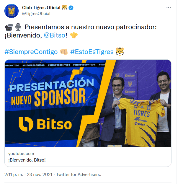 El equipo de Tigres es el primero de la Liga MX en anunciar su entrada al comercio digital mediante una alianza con Bitso, plataforma dedicada a la compra y venta de criptomonedas."Esta alianza marca nuestra entrada al mundo de los deportes a nivel mundial y es el primer patrocinio de una empresa de criptomonedas en el futbol nacional", dijo José Molina, director global de marketing de Bitso, en conferencia de prensa.Esta relación tendrá una duración de tres años a partir del próximo Torneo Clausura 2022, que está programado para comenzar en enero, e irá más allá de la presencia de la marca Bitso en el jersey de los felinos.Mauricio Culebro, presidente del equipo, comentó que Tigres explorará "nuevas oportunidades" para interactuar con la afición y los futbolistas mediante el uso de criptomonedas."Explorar nuevas oportunidades para el club como aceptar pagos en criptomonedas en la tienda virtual, taquilla, así como ver la posibilidad de que nuestros jugadores puedan recibir su salario en criptomonedas en un futuro y ¿por qué no?, también explorar otras posibilidades dentro del mercado de transferencias de jugadores", explicó Culebro.Este convenio implica que los jugadores de Tigres participarán en la generación de contendido educativo para que los aficionados se acerquen y conozcan más de las criptomonedas y del comercio digital.Fundados en 1960, los Tigres, siete veces campeones del futbol mexicano, cuenta con una base de 42 mil aficionados con abono para el estadio Universitario.OF