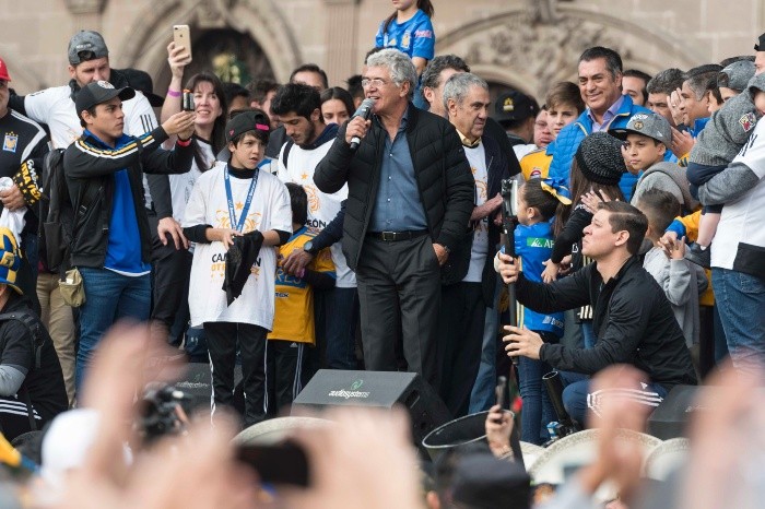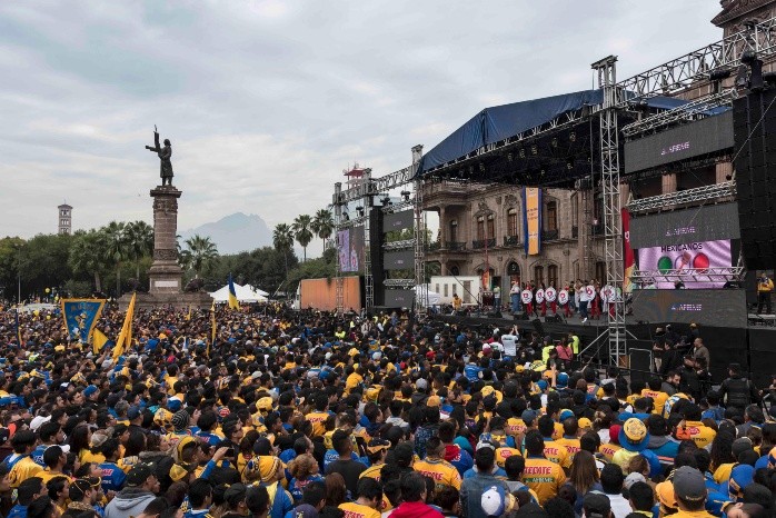 Los Tigres de la UANL celebraron hoy el título del Torneo Apertura 2017 con un desfile y una concentración masiva en la Macroplaza, donde unos 60 mil aficionados los ovacionaron y entonaron cánticos para el plantel que logró el sexto campeonato en la historia del club.Desde temprana hora, llegaron al lugar los seguidores de los felinos para esperar al conjunto de la UANL, con el que querían celebrar el campeonato que obtuvieron el domingo en el cotejo de vuelta de la final.En la zona de la Macroplaza, la gente no dejaba de entonar algunos cánticos y fue cerca de las 13:30 horas cuando el conjunto arribó al templete instalado en la Explanada de los Héroes, frente al Palacio de Gobierno.El equipo dirigido por el estratega brasileño Ricardo "Tuca" Ferretti disfrutó cada instante, dado que surgieron los cánticos incesantes de parte de los presentes.El guardameta Nahuel Guzmán fue quien tomó el micrófono para acompañar los cánticos y poner mayor ambiente a la fiesta de los felinos por haberle ganado la corona a los Rayados de Monterrey en el Apertura 2017.En el lugar estuvo la directiva de los de la UANL, encabezada por Alejandro Rodríguez, y el técnico Ricardo Ferretti, quienes disfrutaron también la música del mariachi que estuvo en la Macroplaza.Así, los felinos celebraron con miles de sus aficionados el haber conseguido el sexto título de su historia y ahora el plantel comenzará con un receso breve para volver a la actividad de cara al próximo Torneo Clausura 2018.De acuerdo con cifras de Protección Civil del Estado, en la zona de la Macroplaza se concentraron unas 60 mil personas que acudieron a los festejos de los felinos, sin que se reportaran incidentes que lamentar.LS