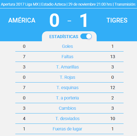Tigres se apuntó el primer capítulo de la semifinal del Apertura 2017 ante América imponiéndose 1-0 en el partido de ida llevado a cabo en el Estadio Azteca.El único gol del partido fue anotado de penalti por Juninho al minuto 48.Los equipos ofrecieron una primera parte cautelosa, que fue marcada por las imprecisiones de ambos bandos.Darwin Quintero, de América, desperdició dos ataques azulcremas con un par de pases equivocados, uno al 25' y otro al 29'.Tigres, por su parte, hizo poco con los ocho tiros de esquina que logró producir en la primera parte.Dos de las mejores ocasiones de los felinos se produjeron gracias a tiros desde afuera del área, uno de Vargas al 34' y otro de Gignac al 41'.El único gol del partido llegó por la vía del penalti. Al minuto 48 Bruno Valdez, de América, se barrió para cortar un centro de Valencia y no pudo evitar que el balón golpeara primero su cara y después su mano. Aun así, el árbitro Oscar Macías Romo decretó penalti, que Juninho convirtió al 48'.En una espectacular acción, Mateus Uribe de América, estuvo cerca de empatar con una chilena 83', pero su tiro salió desviado de la portería de Tigres.El partido de vuelta se disputará el próximo sábado 2 de diciembre a las 19:00 horas en el estadio Universitario, de los Tigres.ALINEACIONESAMÉRICA (5-3-2): Marchesín; Samudio, Vargas, Valdez (Díaz, 77'), Álvarez, Aguilar; Da Silva (Lainez, 70'), Rodríguez, Uribe; Quintero (Ibarra, 59'), Peralta. DT: Miguel Herrera.TIGRES (4-4-2): Guzmán; Torres, Juninho (Meza, 53'), Ayala, Rodríguez; Aquino, Dueñas, De Souza, Valencia (Damm, 87'); Vargas (Zelayarán, 81'), Gignac. DT: André-pierre Gignac. DT: Ricardo Ferretti.ÁRBITRO: Oscar Macías Romo LS