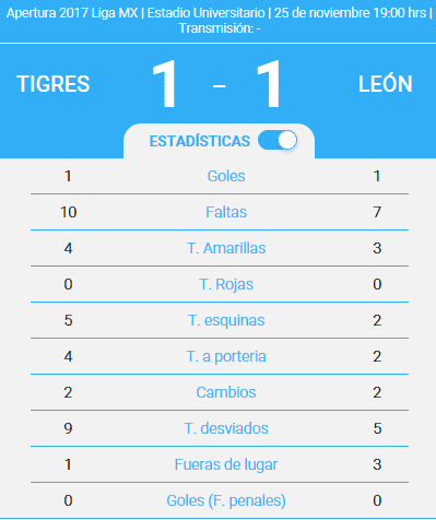 Tigres, segundo lugar general, se convirtió en el primer semifinalista del Apertura 2017 al igualar 1-1 con León, séptimo lugar, en partido de vuelta de cuartos de final disputado en el Estadio Universitario, casa de los auriazules.En la ida, jugada en León, el marcador fue 1-1. El global 2-2 hace avanzar a Tigres por su mejor posición en la tabla general.Como en el primer partido, Tigres fue más vistoso al ataque, pero León logró equilibrar en base a inteligencia y buen futbol.Los norteños buscaron con insistencia anotar de lejos. Al final del primer tiempo acumulaban cinco disparos desviados por uno solo del León.Aunque los tiros distantes fueron uno de los elementos principales de la ofensiva de Tigres, su primer gol llegó en una acción de tiro de esquina por izquierda que Gignac remató de cabeza al minuto 20'.León no permitió que pasara mucho tiempo antes de igualar. Al minuto 24, en un tiro libre cobrado por Elías Hernández, Aquivaldo Mosquera recibió el balón, se quitó de encima a su marcador y anotó el 1-1, que era 2-2 en el marcador global.Al minuto 43 Gignac dejó ir lo que pudo haber sido el segundo gol del partido para los Tigres, mandando fuera de la cancha un remate sutil por encima del portero Yarbrough.Ya en el segundo tiempo, al minuto 48, Gignac dejó escapar una jugada similar.En la segunda parte ningún equipo encontró claridad y el marcador no se movió, dando el pase a semifinales a los Tigres por su posición en la clasificación en la fase regular del certamen.Ahora Tigres espera conocer a su rival en semifinales, que saldrá de alguno de los vencedores de los otros duelos de cuartos de final: Monarcas-Toluca, que se disputa hoy sábado a las 21:00 horas; Monterrey-Atlas, que tendrá lugar mañana domingo a las 18:00; y Cruz Azul-América, que se jugará mañana a las 20:00 horas.ALINEACIONESTIGRES: Guzmán, Vendrechovski, Ayala, Torres, Rodríguez, De Souza, Dueñas, Aquino, Damm (Sosa, 62'), Vargas (Vásquez, 85'), Gignac. D.T.: Ricardo Ferretti.LEÓN: Yarbrough, Mosquera, González, Navarro, Cornejo (Montes, 62'), Mejía, Rodríguez, Hernández, Andrade, Ramos (Cerato, 67'), Boselli.ÁRBITRO: Jorge Antonio Pérez Durán.SA/RR