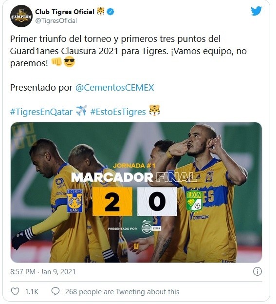 La noche de este sábado en su debut en el torneo Guard1anes, los Tigres vencieron al actual campeón los Panzas Verdes del León 2-0 en el inicio del torneo de la Liga MX.En un duelo cerrado, André-pierre Gignac al minuto 39 cobró desde fuera del área en un tiro libre a segundo palo para vencer al guardameta del León.Para el complemento, los de la UANL con el marcador a su favor controlaban el esférico, a pesar de los embates de los Esmeraldas.Al minuto 67, en una jugada por la izquierda entre Carioca y Pizarro para sacar un centro al área chica a la posición de Carlos González, controló el balón, disparó pero el arquero logró salvar; sin embargo, el balón le volvió a caer a Carlos y en contrarremate se estrenó como goleador de los felinos.Para la jornada 2, Leon recibe a los Tuzos del Pachuca, mientras que los Tigres visitan al Santos Laguna.JM