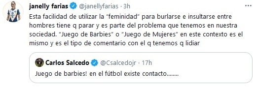 Luego de ser expulsado del partido entre Tigres y América, Carlos Salcedo publicó un mensaje en sus redes sociales en el que señaló "Juego de barbies! En el futbol existe contacto".Ante este mensaje, Janelly Farías, futbolista del América Femenil, contestó a la publicación del "Titán" y expresó que es una situación que se debe detener en busca de la equidad de género."Esta facilidad de utilizar la "feminidad" para burlarse e insultarse entre hombres tiene que parar y es parte del problema que tenemos en nuestra sociedad. "Juego de Barbies" o "Juego de Mujeres" en este contexto es el mismo y es el tipo de comentario con el que tenemos que lidiar.Mis compañeras Liga Femenil y yo de manera diaria. Basta ver un par de partidos de la liga para darse cuenta que en el Futbol Femenil hay muchísimo contacto y la intensidad no pasa por ser hombre o mujer", continuó.Por último, la jugadora remarcó, "Lo que para algunos son comentarios casuales para nosotras han sido barreras toda la vida. En el camino hacia la inclusión y la igualdad todos somos parte de la solución y el futbol femenil aún necesita mucho apoyo y concientizacion de todas las partes involucradas".El defensor de los Tigres o el cuadro norteño no se han manifestado al respecto.JB