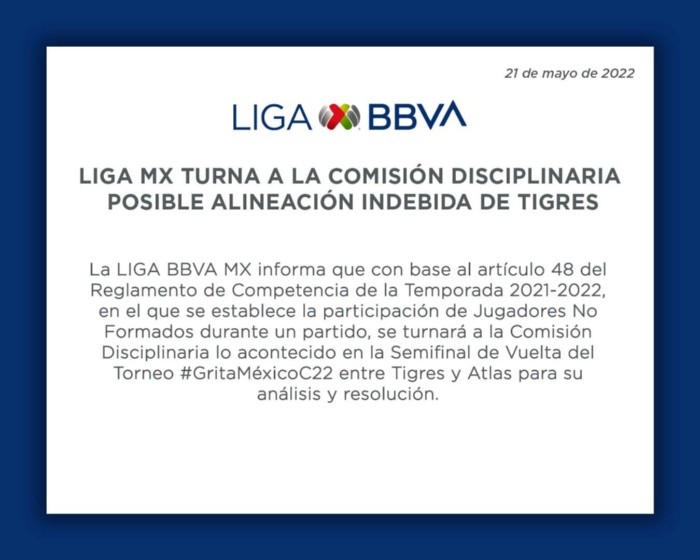 El partido entre Tigres y Atlas por las Semifinales de Vuelta del Clausura 2022 estuvo repleto de polémica y es que a los penales, las revisiones en el VAR, la expulsión de Nahuel Guzmán hay que sumarle que Miguel Herrera incurrió en alineación indebida durante el encuentro. Fue al inicio del Segundo Tiempo cuando Miguel Herrera mandó al campo a Florian Thauvin en sustitución de Hugo Ayala. El problema es que con esto los Felinos tenían 9 jugadores extranjeros en la cancha y el reglamento solo permite 8. Nahuel Guzmán, Guido Pizarro, Igor Licnovsky, Rafael Carioca, Yeferson Soteldo, André-Pierre Gignac, Carlos González y Florian Thauvin, fueron los jugadores extranjeros que coincidieron dentro del terreno de juego. Debido a esto, la Liga MX informó a través de un comunicado que la Comisión Disciplinaria iniciará una investigación por la alineación indebida de los Universitarios y tomará las medidas correspondientes al reglamento. “La Liga MX informa que, con base en el artículo 48 del Reglamento de Competencia de la Temporada 2021-2022, en el que se establece la participación de Jugadores No Formados durante un partido, se turnará a la Comisión Disciplinaria lo acontecido en la Semifinal de Vuelta del Torneo #GritaMéxicoC22 entre Tigres y Atlas para su análisis y resolución”, se lee en el comunicado. Ya hay antecedentes que determinan que Tigres sí cometió una infracción y aunque el castigo no se ha dado a conocer, apegándose al reglamento, Atlas ganará el partido por 2-0, debido a que se eliminarán los goles marcados por el conjunto felino como castigo a la alineación indebida. JL