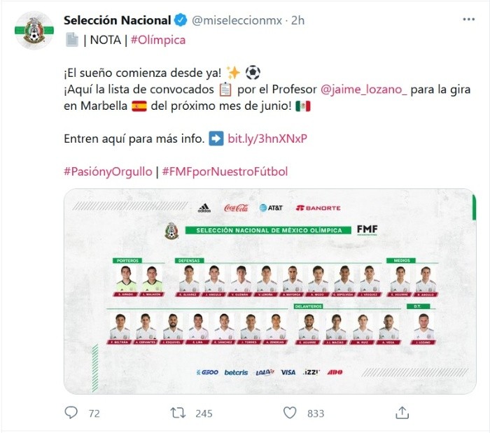 Como parte de la preparación de la Selección mexicana Sub-23 que disputará los Juegos Olímpico de Tokio, se anunció la lista de convocados de Jaime Lozano para la gira por Marbella, España.México concentrará desde el 29 de mayo al 13 de junio.En suelo español, el Tricolor enfrentará el cinco de junio a Rumania, el día ocho a Arabia Saudí y el 12 del mismo mes cerrará sus partidos de esta gira ante Australia.JM