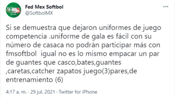 La Federación Mexicana de Softbol se manifestó este jueves tras divulgarse imágenes donde se observa el uniforme de las jugadoras tirado en la basura de la Villa Olímpica. El equipo mexicano quedó en cuarto lugar durante los Juegos Olímpicos de Tokio 2020, sin embargo, lo que hicieron con el uniforme causó polémica y ha desatado el debate en las redes sociales. La Federación Mexicana de Softbol publicó en su cuenta de Twitter que "si se demuestra que dejaron uniformes de juego competencia, con su número de casaca no podrán participar más con la Federación Mexicana de Softbol". En el tuit se detalló el equipo con el que viajaron las representantes mexicanas: un par de guantes, casco, bates, guantes, caretas, catcher, zapatos de juego (tres pares) y de entrenamiento (seis). Las boxeadoras mexicana Brianda Cruz y Esmeralda Falcón fueron quienes compartieron las imágenes tomadas en la Villa Olímpica.Por su parte, Rolando Guerrero, Presidente de la Federación Mexicana de Softbol, respondió a las acusaciones en entrevista para Azteca Deportes: "La decisión de dejar uniformes usados, fue porque tenían que hacer espacio en sus maletas"."No es lo mismo empacar 33 bates que traemos, arreos de juego, los tres uniformes, los de entrenamiento. Con todo respeto ni vamos a atacar, ni vamos a responder, ni decir nada en las redes. Simple y sencillamente fue un hecho de sobrepeso", explicó.¡La cobertura de los Juegos Olímpicos no termina aquí! Descubre los contenidos exclusivos que tenemos preparados en INFORMAPlus, la aplicación digital de EL INFORMADOR, en donde a partir de las 12:00 del día, al término de cada jornada deportiva, se publicará un suplemento exclusivo con todos los detalles de lo que sucede en Tokio 2020.Más fotografías, más información y más datos sobre todos los atletas que buscan conquistar la gloria olímpica. Descarga la aplicación y pruébala GRATIS por treinta días. OF