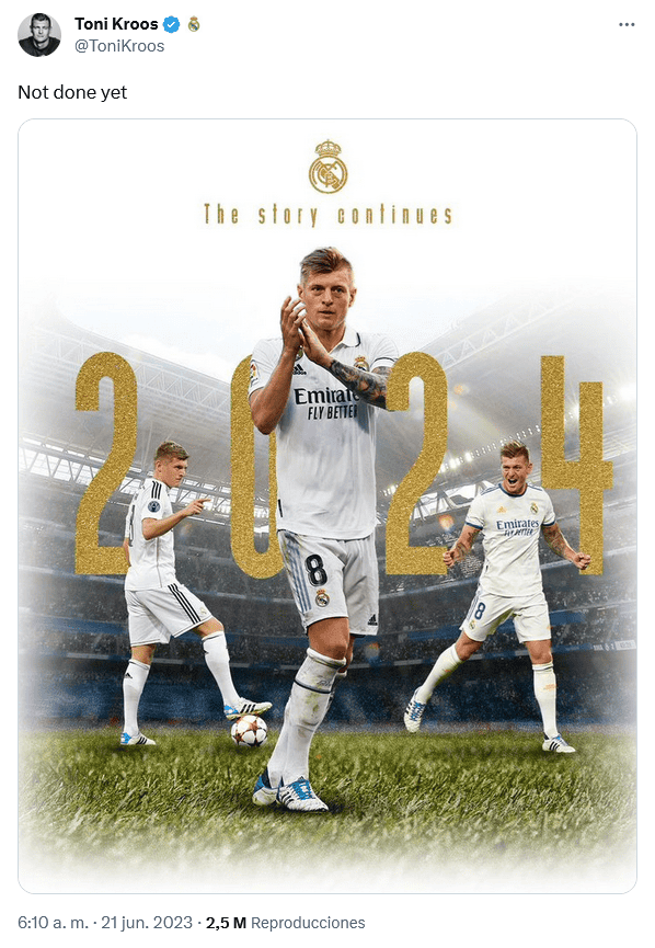 El mediocampista del Real Madrid, Toni Kroos, acordó hoy miércoles renovar su contrato con el equipo español hasta el final de la próxima temporada.Toni Kroos, de 33 años, emprenderá su décima campaña con el Madrid luego que las partes acordaron extender extender el contrato hasta el 30 de junio de 2024. El actual contrato expiraba al final de este mes."Esto aún no termina", escribió Kroos en su cuenta de Twitter. Kroos, quien se retiró de la Selección de Alemania en 2021, ha disputado 417 partidos con el Madrid.Procedente del Bayern Múnich, Kroos llegó al Madrid en 2014 tras consagrarse campeón mundial con Alemania en Brasil. Ha sido parte fundamental del plantel que desde entonces ha conquistado cuatro títulos de la Champions League y tres de la Liga española.Kroos integrará un nutrido bloque de centrocampistas del Madrid, con Aurélien Tchouaméni, Eduardo Camavinga, Federico Valverde y el recién fichado Jude Bellingham. También se prevé que el club termine ampliando los contratos de Luka Modric y Dani Ceballos.OF