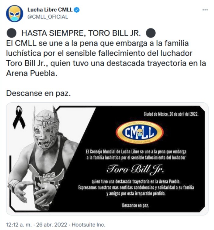 ¡Tragedia! El luto invadió la lucha libre mexicana, pues falleció de un infarto el gladiador Toro Bill Jr. tras participar en una función en la Arena Puebla.El Consejo Mundial de Lucha Libre (CMLL) confirmó en sus redes sociales el fallecimiento del luchador poblano."Hasta siempre Toro Bill JR. El CMLL se une a la pena que embarga a la familia luchística por el sensible fallecimiento del luchador Toro Bill Jr., quien tuvo una destacada trayectoria en la Arena Puebla. Descanse en paz", escribió el CMLL.Toro Bill formó parte del elenco de la función del lunes 26 de abril en el recinto. El gladiador hizo pareja con Prayer en la segunda lucha de la noche ante Asturiano y Millenium.Toro Bill Junior debió de ser retirado de la Arena en camilla y reportes señalan que paramédicos y gente del coloso poblano se movilizó con urgencia en el área de los vestidores.OF