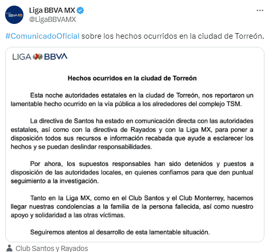 Ayer domingo 21 de enero, Santos Laguna recibió a Rayados de Monterrey como parte de la agenda de la Jornada 2 del Torneo Clausura 2024. El marcador terminó con saldo de 2-0 favorable para los regios, cuyos aficionados salieron contentos con la victoria. Sin embargo, el resultado se tiñó de rojo tras un incidente registrado a las afuera del Estadio TSM.De acuerdo con reporte de medios nacionales, un grupo de seguidores de Rayados se encontraba frente a un puesto de alimentos cuando fueron embestidos por una camioneta. Señalan que varias personas quedaron heridas, mientras que se confirmó la muerte de una mujer.Tras el hecho, la Liga MX emitió un comunicado en el que informó que las autoridades locales reportaron lo ocurrido, y que la directiva de Santos Laguna está a disposición para aportar todos los recursos e información recabada que ayude a esclarecer lo acontecido y que se puedan deslindar responsabilidades.Además, dio a conocer que los presuntos responsables ya fueron detenidos, puestos a disposición de la autoridad, en espera de que den puntual seguimiento a la investigación.Al final, dice que tanto Santos como Monterrey ofrecen sus condolencias a la familia de la persona fallecida, así como el apoyo y solidaridad con las otras víctimas.*Mantente al día con las noticias, únete a nuestro canal de WhatsApp OF