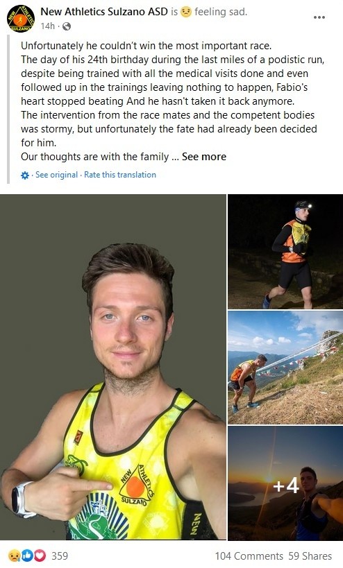 Un atleta italiano de 24 años murió en plena carrera debido a un paro cardíaco. Fabio Pedretti disputaba la prueba nocturna "Uno di Monticelli", una carrera de 27 kilómetros en el norte de Italia, informaron este domingo los organizadores de la competencia."Destrozados e incrédulos ante una de las tragedias imposibles de explicar de la vida, apoyamos con cariño a la familia de Fabio y la gloriosa sociedad New Athletic Sulzano (a la que pertenecía el atleta)", se lee en el comunicado de la organización.Pedretti falleció en la noche de este sábado 4 de diciembre, en el día de su 24 cumpleaños, por un paro cardíaco sufrido a cinco kilómetros de la meta.Fue socorrido de forma inmediata y desplazado a un cercano hospital, pero los doctores no pudieron salvarle la vida.IM