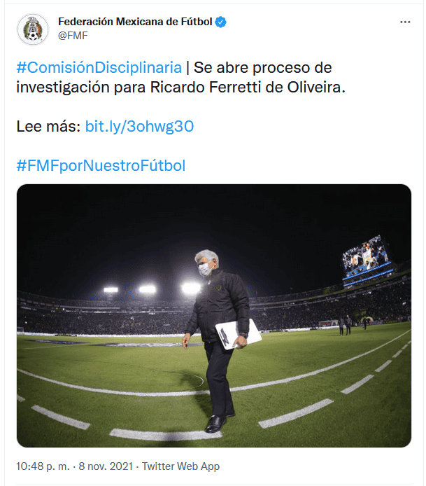 La Federación Mexicana de Futbol (FMF) anunció que abrió una investigación contra el técnico de Tigres, Ricardo "Tuca" Ferretti, por las declaraciones emitidas en la conferencia de prensa posterior al partido Tigres vs Bravos en el Estadio Universitario. Se considera que las palabras que utilizó el brasileño son homofóbicas y discriminatorias."¿Hay viejas? No, ¿verdad?", dijo Ferretti, quien es común que inicie sus ruedas de prensa dándole la primera pregunta a una periodista mujer. "¿Maricones? El primero, ¿Quién va a ser el primer maricón? Puros machos entonces", dijo "Tuca" Ferretti tras el partido Tigres vs Juárez, de la J17 del Torneo Apertura 2021. Su equipo cayó por 3-0 en ese encuentro."Una vez que esta Comisión Disciplinaria realice el análisis de las pruebas y demás documentos aportados, emitirá la resolución correspondiente", dice el comunicado de la FMF.Los dichos de "Tuca" Ferretti fueron muy criticados, sobre todo en redes sociales, debido a que actualmente los dirigentes del futbol mexicano tratan de erradicar las expresiones homofóbicas en este deporte. El grito que los aficionados lanzan durante los despejes de los porteros en los estadios le han acarreado varias sanciones (multas y vetos) por parte de la FIFA.Antes de que se diera a conocer la investigación contra "Tuca", el presidente de la Liga MX, Mikel Arriola, había mencionado que "seguramente la comisión va a abordar un procedimiento donde se le abra a las partes el derecho de ser escuchados, pero yo reitero que en la Liga MX no se va a insultar a nadie".Esta es la primera investigación por comentarios homofóbicos que se realiza contra un técnico en México. El entrenador Miguel "Piojo" Herrera fue suspendido en 2019, pero por haber utilizado una frase discriminatoria contra el árbitro Marco Antonio Ortiz.OF