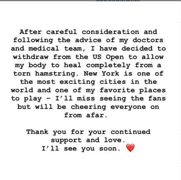 La ex número uno del mundo Serena Williams anunció este miércoles que un desgarro en el tendón de la pierna derecha le impedirá disputar el Abierto de Tenis de Estados Unidos, cuyo sorteo se cumplirá este jueves.La menor de las hermanas Williams no ha competido por este motivo desde finales de junio, cuando se lesionó durante su debut en Wimbledon.Serena Williams ha ganado 23 títulos individuales de Grand Slam, un récord en la era profesional. Solo una jugadora en la historia del tenis posee más: la australiana Margaret Court con 24."Después de una cuidadosa consideración y siguiendo los consejos de mis doctores y equipo médico, he decidido retirarme del US Open para permitir que mi cuerpo se cure por completo de un tendón de la corva desgarrado", escribió Williams. Su nota terminaba con el aviso: "Te veré pronto".El entrenador de Williams, Patrick Mouratoglou, también publicó una nota en las redes sociales. "Es desgarrador, pero esta es la única decisión posible".La estadounidense, que cumplirá 40 años el mes próximo, se suma así a una lista de bajas ilustres compuesta por el suizo Roger Federer, el español Rafael Nadal, así como el campeón del año pasado, el austríaco Dominic Thiem.Williams ha ganado seis campeonatos individuales en el Abierto de Estados Unidos, el más reciente en 2014. En sus cinco apariciones en el torneo de cancha dura en Nueva York desde entonces, ha llegado a la final dos veces. Perdió ante la japonesa Naomi Osaka en 2018 y la canadiense Bianca Andreescu, en 2019.Esta temporada, fue semifinalista en el Abierto de Australia en febrero, antes de perder ante la eventual campeona, Osaka. En el Abierto de Francia, jugado en arcilla roja, Williams perdió en la cuarta ronda ante la kazako Elena Rybakina. Si quieres tener más contenido, más imágenes y aún más noticias, entonces descarga INFORMAPlus, la aplicación digital de EL INFORMADOR, donde tenemos materiales exclusivos para tí.Descarga la aplicación y pruébala GRATIS por treinta días. Para iOS: https://apple.co/35jaVgbPara Android: https://bit.ly/3gwVSEVSi eres suscriptor de EL INFORMADOR tu acceso está incluido, solicítalo al 33 3678-7777JL