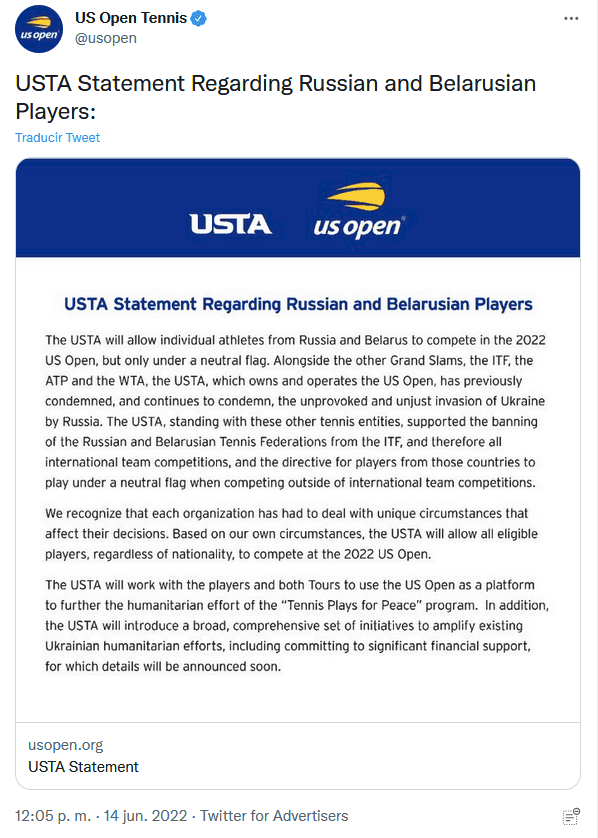 Es oficial. Este martes, organizadores del US Open de Tenis (Abierto de Estados Unidos) dieron a conocer que los jugadores de Rusia y Bielorrusia podrán participar en la competencia, pero deberán hacerlo bajo la condición de bandera neutral.La medida se tomó después de que se condenara la invasión de Rusia en Ucrania.La Asociación de Tenis de EU informó que cada Grand Slam ha tenido que enfrentarse a "circunstancias únicas", y en su caso, el US Open permitirá "que compitan todos los jugadores cualificados, independientemente de su nacionalidad".Indicó que trabajará con los tenistas y sus circuitos para que usen el certamen como "plataforma" para promover su programa humanitario "Tennis Plays for Peace".El US Open de tenis se realizará en el mes de agosto en el parque Flushing Meadows, de Nueva York.OF