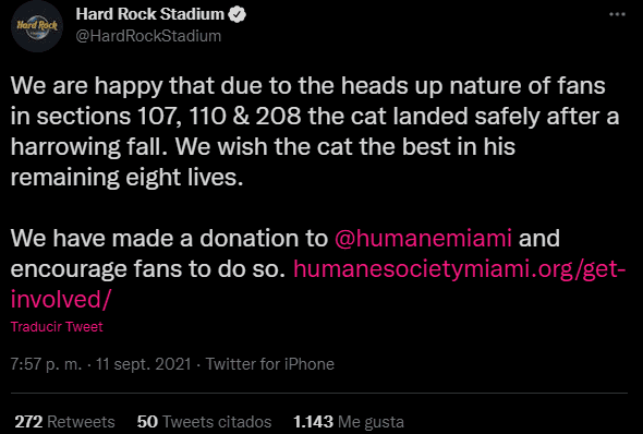 Un gato fue salvado de una caída de unos 20 metros durante un partido de la NFL, algo que alborotó por unos minutos a los aficionados del Hard Rock Stadium.Mientras el partido estaba en marcha, los aficionados del Miami Hurricanes —que enfrentaban a los Appalachian State— intentaron salvar al gato que estaba colgado con sus patitas en un alambre de un palco.Incluso un grupo de aficionados sostuvo la bandera de Estados Unidos para que, si el gato caía, esta pudiera servir como un amortiguador al golpe.Cuando al fin el gato no pudo sostenerse más del alambre, cayó directo a la bandera sano y salvo, algo que alegró a los asistentes, quienes celebraron con gritos y aplausos.Incluso el Hard Rock Stadium confirmó en Twitter que los fanáticos de las secciones 107, 110 y 208 pudieron mantener seguro al gato después de “una caída desgarradora”. “Le deseamos lo mejor al gato en las ocho vidas que le quedan”, dijo el estadio. Además, subrayó que hizo una donación a Humane Society Miami, un centro de garantía de adopción de mascotas.El encuentro entre Miami Hurricanes y Appalachian State terminó a favor de los primeros, con un resultado final de 25 a 23.***Si quieres tener más contenido, más imágenes y aún más noticias, entonces descarga INFORMAPlus, la aplicación digital de EL INFORMADOR, donde tenemos materiales exclusivos para tí.Descarga la aplicación y pruébala GRATIS por treinta días. Para iOS: https://apple.co/35jaVgbPara Android: https://bit.ly/3gwVSEVSi eres suscriptor de EL INFORMADOR tu acceso está incluido, solicítalo al 33 3678-7777AC