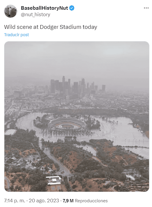 El fin de semana, el equipo de Los Angeles Dodgers de las Grandes Ligas de Beisbol (MLB, por sus siglas en inglés) movió la programación de sus partidos del fin de semana. El viernes jugó su primer duelo de la serie ante los Miami Marlins, pero el sábado fue doble cartelera debido a que, por las condiciones climáticas que se pronosticaban, se adelantó el encuentro del domingo. Aunque el conjunto californiano se impuso en los dos juegos del segundo día, no fue eso lo que llamó la atención; tampoco fue el gran trabajo del mexicano Julio Urías, quien abrió para finalizar la jornada ese día y terminó recibiendo sólo una carrera en siete entradas de trabajo, además de 5 ponches. Una serie de eventos deportivos fueron suspendidos o reprogramados ante la llegada de "Hilary". El ciclón alcanzó la categoría 4 de huracán en la escala Saffir-Simpson, sin embargo, a tierras estadounidenses llegó como tormenta tropical. Ante la amenaza, uno de los afectados fue precisamente el choque de tres días entre Dodgers y Marlins, y una foto aérea tomada el domingo dio cuenta de la situación por el mal tiempo.En Internet circuló la imagen que dejaba ver cómo terminaron de inundadas las calles aledañas al estadio de Chavez Ravine debido a las fuertes lluvias de los dos días. El equipo de los San Diego Padres también tuvo que mover su calendario debido a las condiciones climáticas.La mañana de este lunes, el equipo de los Dodgers publicó el estado de las calles después de la inundación con el mensaje: "¿Está de moda el estadio de los Dodgers? Lo entendemos. Se ve hermoso esta mañana".OF