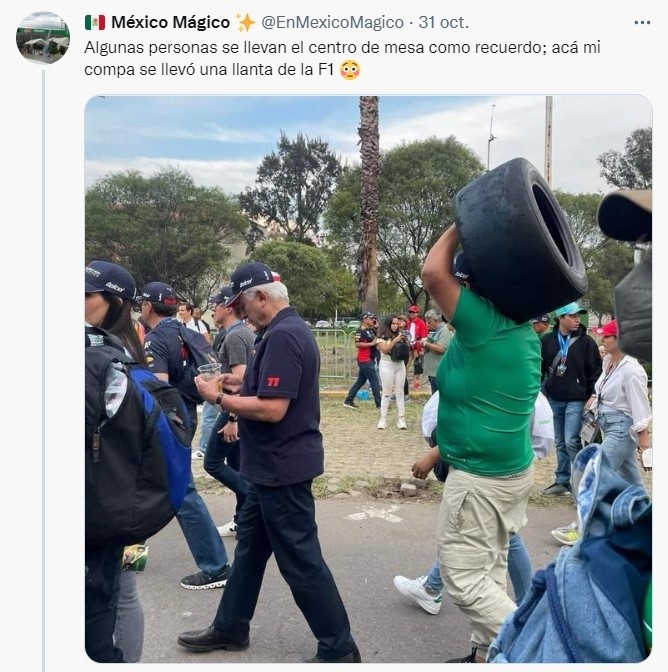 El Gran Premio de México de la Fórmula 1 fue una auténtico éxito. Durante los tres días que duró el evento organizado en el Autódromo Hermanos Rodríguez, se vivieron un sinfín de emociones y anécdotas dentro y fuera de la pista. Fue el caso de un hombre que fue captado saliendo del Autódromo Hermanos Rodríguez cargando una llanta en sus hombros, como si la llevara de recuerdo a su casa. La imagen del aficionado se hizo viral en redes sociales, luego de que la cuenta México Mágico la difundiera acompañada del mensaje "Algunas personas se llevan el centro de mesa como recuerdo; acá mi compa se llevó una llanta de la F1”. La publicación desató una ola de comentarios en donde algunos criticaron la acción del aficionado, pues especulaban que se la había robado. Sin embargo, tanto se hizo viral la foto que el propio protagonista salió a defenderse, asegurando que no la había robado, sino que la compró. "Obviamente no me la robé, en la zona azul estaba el paddock de la F4, y ahí primero las regalaban y después las subastaron hasta en 1500 yo solo pague 200. Lo más genial es que me la firmó el campeón Juan Felipe Pedraza (con dedicatoria para mi hijo) y otro corredor llamado Lucas", dijo Ivan Morales Reyes. El propio aficionado compartió una serie de fotografías de la llanta con la que fue captado saliendo del Gran Premio de México y descartó que la haya robado, sin embargo, la imagen se ha hecho viral en redes sociales y su comentario no es el principal. JL