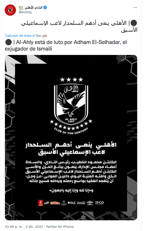 Conmociona en redes sociales y en general a los aficionados del futbol la muerte del entrenador de 52 años Adham El-Selhadar, luego de sufriera un infarto en pleno terreno de juego tras celebrar un gol en tiempo de compensación.El trágico hecho ocurrió en el tiempo agregado del partido El-Magd vs Zaqra, que concluyó con el único tanto del partido anotado al minuto 92. El gol, naturalmente fue celebrado con euforia por parte de todos los jugadores en el campo y en la banca, pues eso significaba salir de la zona de descenso de la segunda división y escalar al séptimo puesto de la clasificación.En videos que circulan en redes sociales, se aprecia el momento en que Adham El-Selhadar celebra, pero después cae inconsciente en el campo. Los jugadores de la banca fueron los primeros en acercarse para auxiliarlo, y posteriormente llegó una ambulancia.Más tarde se dio a conocer que había muerto debido a un paro cardíaco.Varios equipos de la Liga de futbol de Egipto le rindieron un mensaje en honor a quien también fuera jugador.Por ejemplo, el Al-Ahly, primer rival de Rayados de Monterrey en el Mundial de Clubes 2022, publicó un comunicado en sus redes sociales con el mensaje: "El capitán Mahmoud Al-Khatib, presidente del club, y los miembros de la junta directiva, lloran con gran tristeza y dolor al entrenador Adham El-Selhadar, ex jugador de Ismaily, rezando al Todopoderoso para que cubra al difunto con su inmensa misericordia y lo entre en sus vastos jardines".El equipo El-Magd declaró un periodo de seis días de luto, y la suspensión del próximo partido.OF