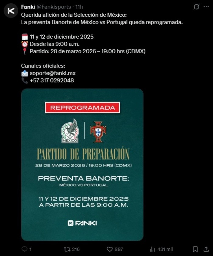 La preventa exclusiva para clientes Banorte de entradas para el partido de reinauguración del estadio Azteca, a celebrarse entre las selecciones de México y Portugal el 28 de marzo de 2026, debía iniciar ayer, sin embargo, fue suspendida por fallas en la plataforma Fanki, encargada de la expedición de los boletos. No obstante, el problema ha sido superado y ya hay una nueva fecha.